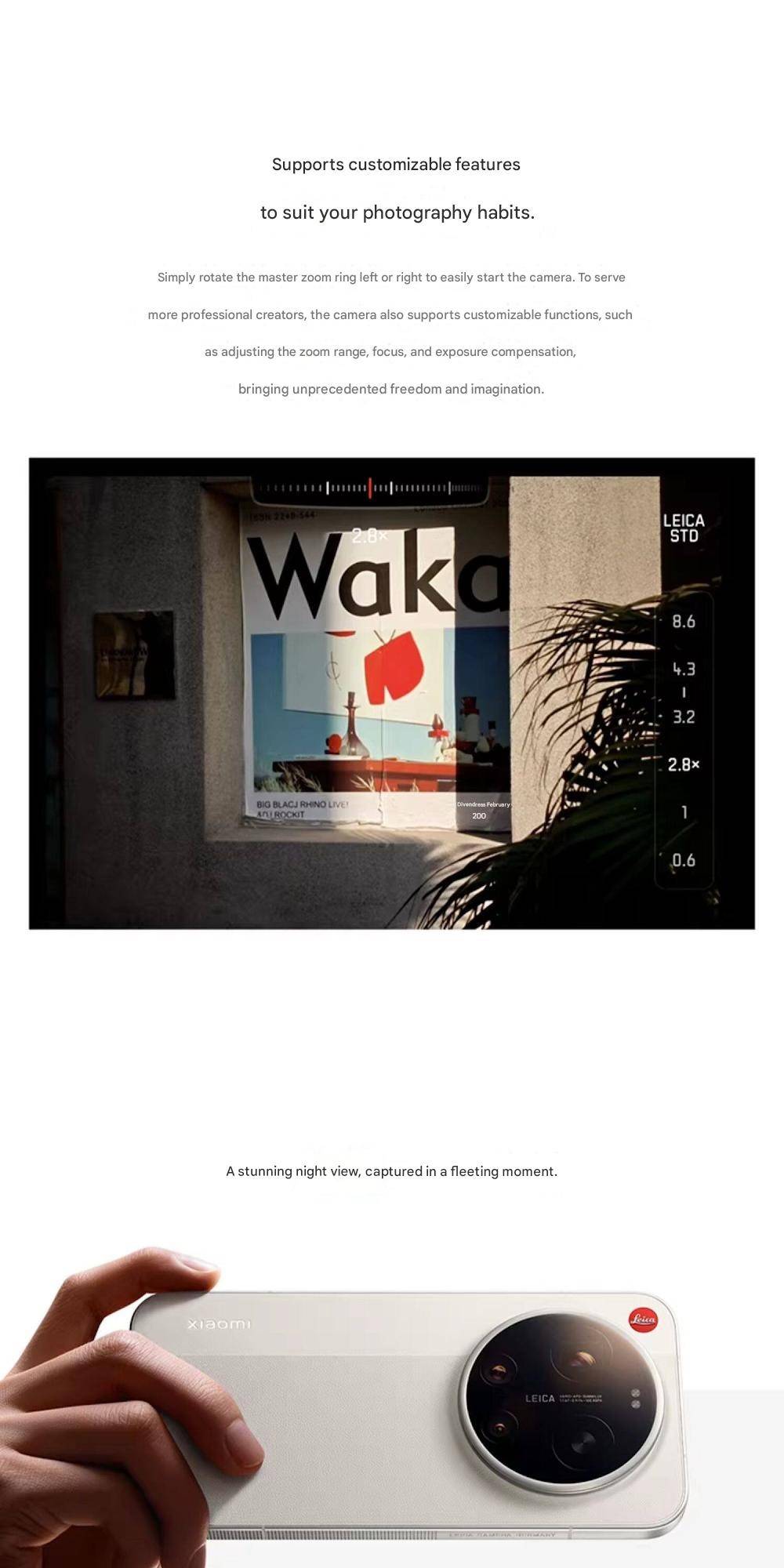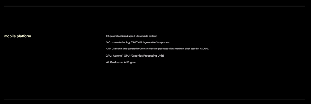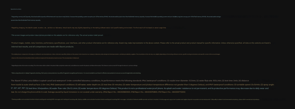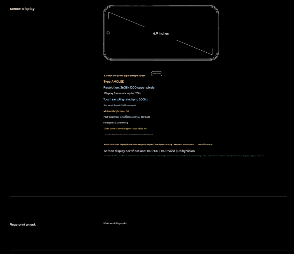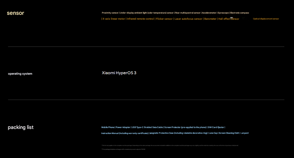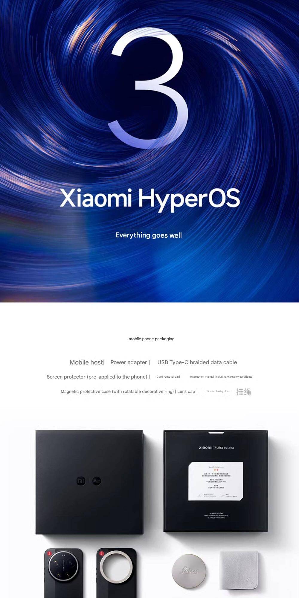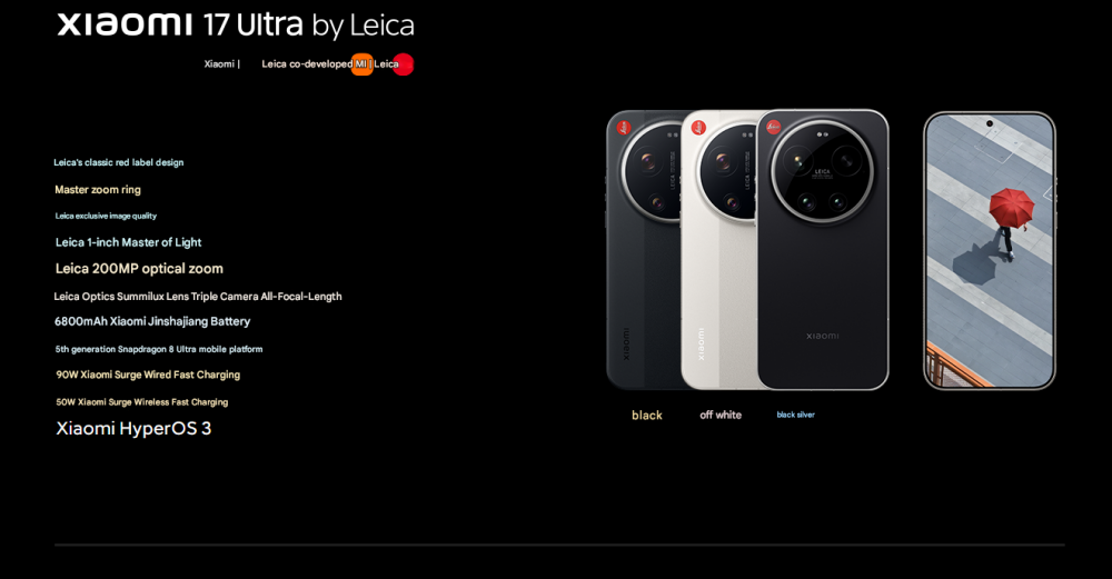 CPU -- -- -- -- -- -- -- 5th Generation Snapdragon 8 Ultra Mobile Platform RAM + ROM --- 16 + 512GB | 16 + 1TB Color ----------- Black | White Screen -- -- -- -- -- 6.9-inch Low-Power Super Sunlight OLED Display, 2608 x 1200 Super Pixels, Up to 120Hz Refresh Rate Battery -- -- -- -- 6800mAh (typ) / 6660mAh (min), supports QC3+ / QC3.0 / QC2.0 / PD3.0 / PD2.0 fast charging protocols / 90W PPS universal fast charging protocol, 90W Xiaomi Surge Wired Fast Charge / 50W Xiaomi Surge Wireless Fast Charge, 22.5W Wired Reverse Charging, supports Wireless Reverse Charging Camera ----------- Leica Summilux High-speed lens Leica 1-inch Master of Light: 50MP | Light Hunter 1050L image sensor | ƒ/1.67 large aperture | Equivalent 23mm focal length | Supports 4-in-1 3.2μm large pixel output | Supports OIS optical image stabilization | QPD focusing | 1G+6P aspherical high lens group Leica 200MP optical zoom: 200MP | 1/1.4″ ultra-large sensor | ƒ/2.39-2.96 large aperture | 3.2-4.3x optical zoom | 30cm telephoto macro | OIS optical image stabilization | 3G+5P aspherical high lens group OS----------- Xiaomi HyperOS 3 Other----------- NFC, Bluetooth 5.4, Dual-Bluetooth, Dolby Atmos, supports Tiantong and Beidou dual satellite communication Network and connectivity: SIM card: Supports dual Nano-SIM SIM card slot, supports dual SIM dual standby, dual SIM HD voice Frequency Bands: 5G: n1 / n2 / n3 / n5 / n7 / n8 / n12 / n13 / n18 / n20 / n25 / n26 / n28 / n38 / n40 / n41 / n48 / n66 / n70 / n77 / n78 / n79 / n80 / n81 / n83 / n84 / n89 Note: Actual network and frequency band usage depends on local operator deployment. The n3 / n80 / n81 / n89 bands require software upgrade support after operator release. 4G: FDD-LTE: B1 / B2 / B3 / B4 / B5 / B7 / B8 / B12 / B13 / B17 / B18 / B19 / B20 / B25 / B26 / B28 / B66 TDD-LTE: B34 / B38 / B39 / B40 / B41 / B42 / B48 3G: WCDMA: B1 / B2 / B4 / B5 / B6 / B8 / B19 2G: GSM: B2 / B3 / B5 / B8 Supports 4×4 MIMO antenna technology / HPUE / HO RxD Packaging containers: Phone unit | Power adapter (CN Version) | USB Type-C braided data cable | Screen protector (pre-applied) | SIM card ejector tool | Instruction manual | Magnetic protective case (with rotating decorative ring) | Lens cap | Screen cleaning cloth | Lanyard