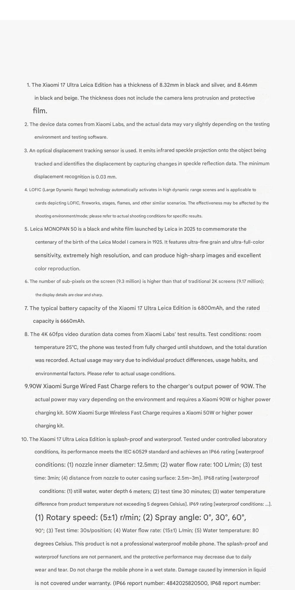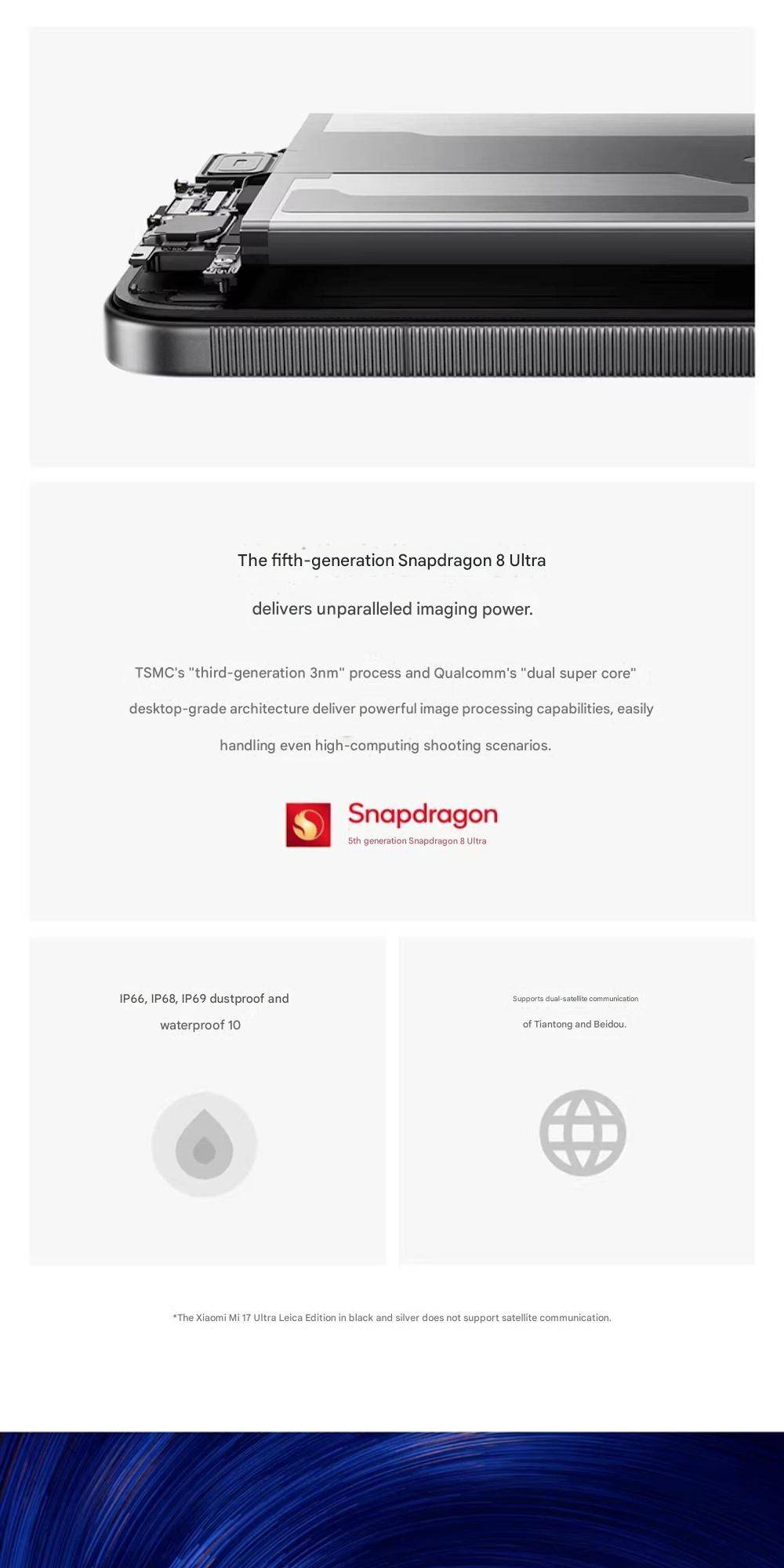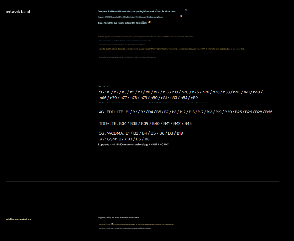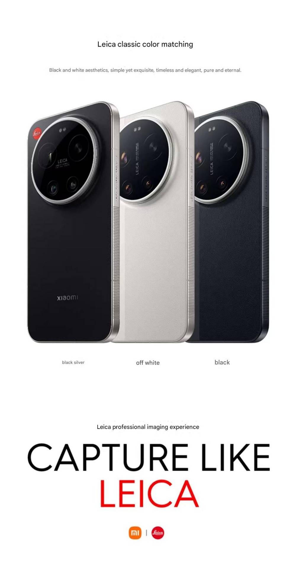 CPU -- -- -- -- -- -- -- 5th Generation Snapdragon 8 Ultra Mobile Platform RAM + ROM --- 16 + 512GB | 16 + 1TB Color ----------- Black | White Screen -- -- -- -- -- 6.9-inch Low-Power Super Sunlight OLED Display, 2608 x 1200 Super Pixels, Up to 120Hz Refresh Rate Battery -- -- -- -- 6800mAh (typ) / 6660mAh (min), supports QC3+ / QC3.0 / QC2.0 / PD3.0 / PD2.0 fast charging protocols / 90W PPS universal fast charging protocol, 90W Xiaomi Surge Wired Fast Charge / 50W Xiaomi Surge Wireless Fast Charge, 22.5W Wired Reverse Charging, supports Wireless Reverse Charging Camera ----------- Leica Summilux High-speed lens Leica 1-inch Master of Light: 50MP | Light Hunter 1050L image sensor | ƒ/1.67 large aperture | Equivalent 23mm focal length | Supports 4-in-1 3.2μm large pixel output | Supports OIS optical image stabilization | QPD focusing | 1G+6P aspherical high lens group Leica 200MP optical zoom: 200MP | 1/1.4″ ultra-large sensor | ƒ/2.39-2.96 large aperture | 3.2-4.3x optical zoom | 30cm telephoto macro | OIS optical image stabilization | 3G+5P aspherical high lens group OS----------- Xiaomi HyperOS 3 Other----------- NFC, Bluetooth 5.4, Dual-Bluetooth, Dolby Atmos, supports Tiantong and Beidou dual satellite communication Network and connectivity: SIM card: Supports dual Nano-SIM SIM card slot, supports dual SIM dual standby, dual SIM HD voice Frequency Bands: 5G: n1 / n2 / n3 / n5 / n7 / n8 / n12 / n13 / n18 / n20 / n25 / n26 / n28 / n38 / n40 / n41 / n48 / n66 / n70 / n77 / n78 / n79 / n80 / n81 / n83 / n84 / n89 Note: Actual network and frequency band usage depends on local operator deployment. The n3 / n80 / n81 / n89 bands require software upgrade support after operator release. 4G: FDD-LTE: B1 / B2 / B3 / B4 / B5 / B7 / B8 / B12 / B13 / B17 / B18 / B19 / B20 / B25 / B26 / B28 / B66 TDD-LTE: B34 / B38 / B39 / B40 / B41 / B42 / B48 3G: WCDMA: B1 / B2 / B4 / B5 / B6 / B8 / B19 2G: GSM: B2 / B3 / B5 / B8 Supports 4×4 MIMO antenna technology / HPUE / HO RxD Packaging containers: Phone unit | Power adapter (CN Version) | USB Type-C braided data cable | Screen protector (pre-applied) | SIM card ejector tool | Instruction manual | Magnetic protective case (with rotating decorative ring) | Lens cap | Screen cleaning cloth | Lanyard