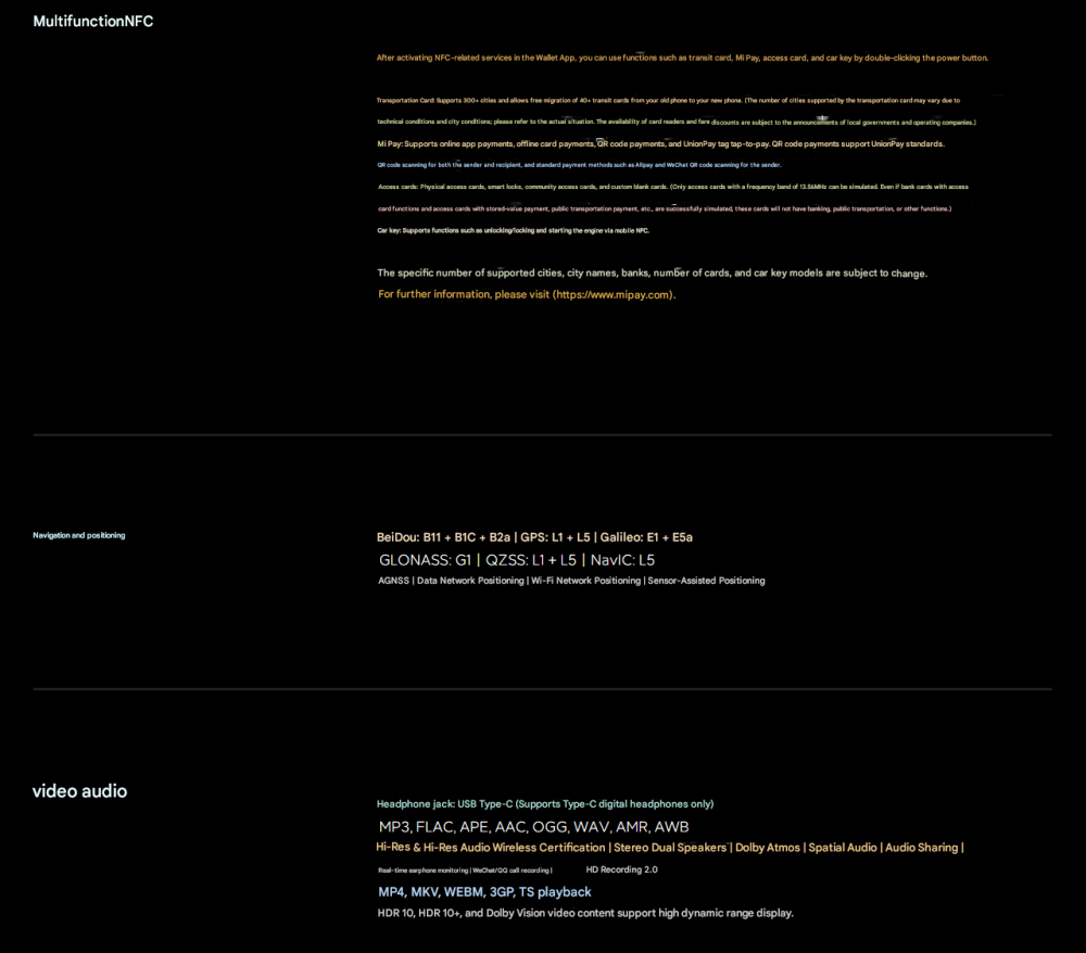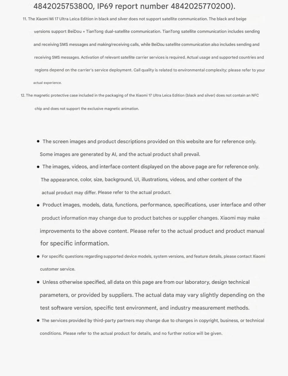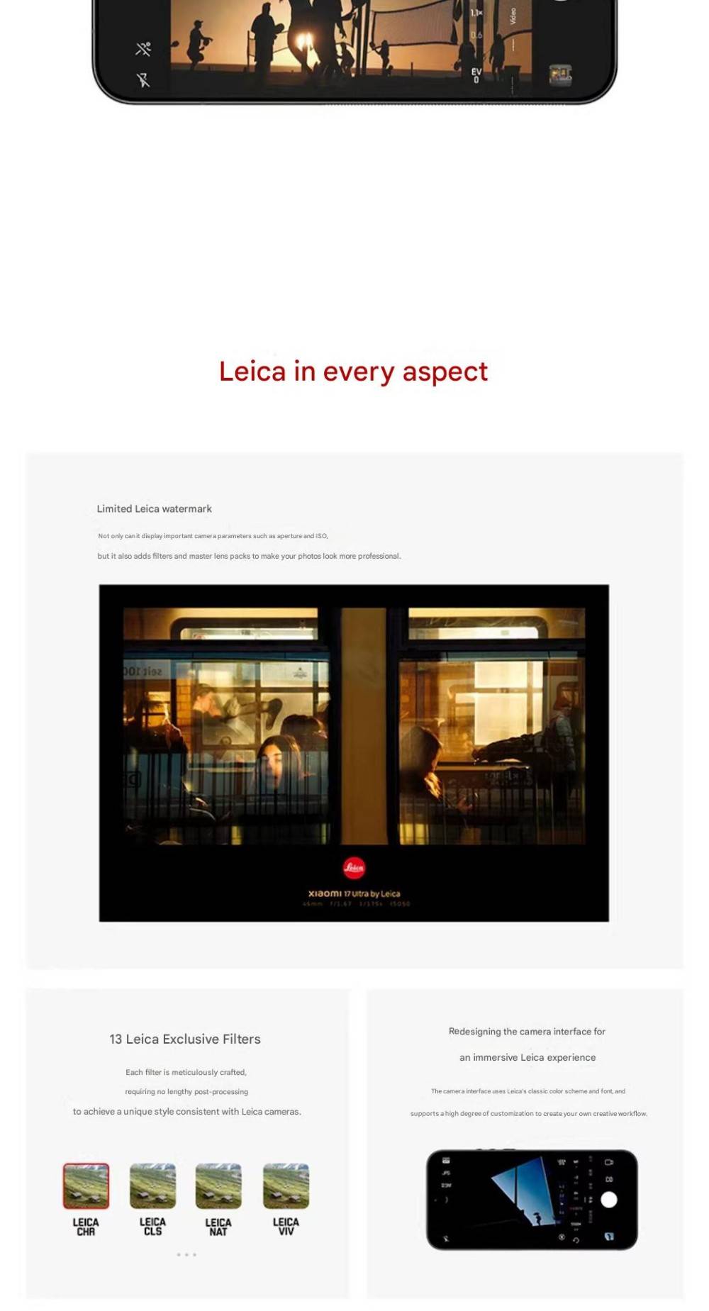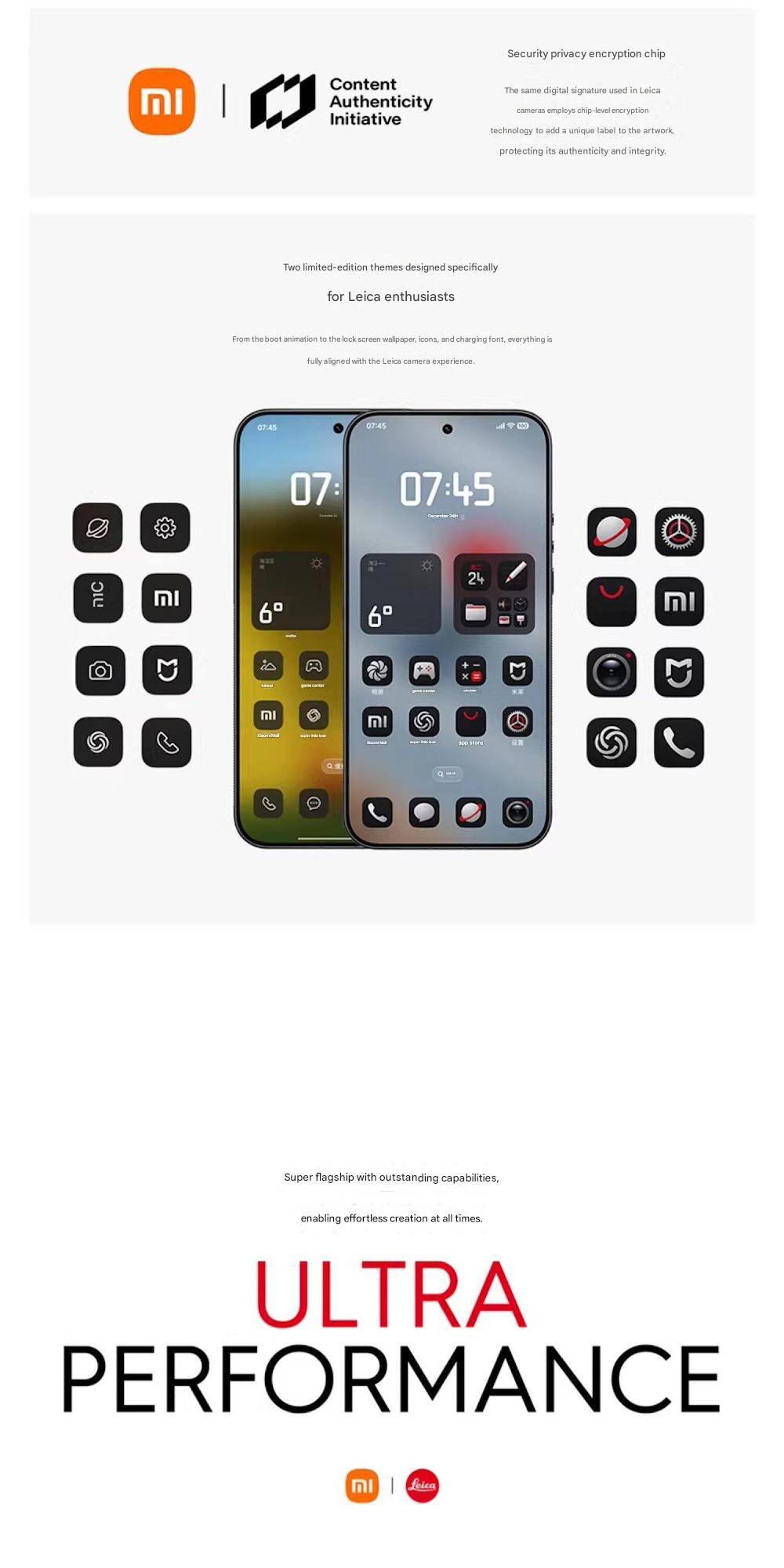 CPU -- -- -- -- -- -- -- 5th Generation Snapdragon 8 Ultra Mobile Platform RAM + ROM --- 16 + 512GB | 16 + 1TB Color ----------- Black | White Screen -- -- -- -- -- 6.9-inch Low-Power Super Sunlight OLED Display, 2608 x 1200 Super Pixels, Up to 120Hz Refresh Rate Battery -- -- -- -- 6800mAh (typ) / 6660mAh (min), supports QC3+ / QC3.0 / QC2.0 / PD3.0 / PD2.0 fast charging protocols / 90W PPS universal fast charging protocol, 90W Xiaomi Surge Wired Fast Charge / 50W Xiaomi Surge Wireless Fast Charge, 22.5W Wired Reverse Charging, supports Wireless Reverse Charging Camera ----------- Leica Summilux High-speed lens Leica 1-inch Master of Light: 50MP | Light Hunter 1050L image sensor | ƒ/1.67 large aperture | Equivalent 23mm focal length | Supports 4-in-1 3.2μm large pixel output | Supports OIS optical image stabilization | QPD focusing | 1G+6P aspherical high lens group Leica 200MP optical zoom: 200MP | 1/1.4″ ultra-large sensor | ƒ/2.39-2.96 large aperture | 3.2-4.3x optical zoom | 30cm telephoto macro | OIS optical image stabilization | 3G+5P aspherical high lens group OS----------- Xiaomi HyperOS 3 Other----------- NFC, Bluetooth 5.4, Dual-Bluetooth, Dolby Atmos, supports Tiantong and Beidou dual satellite communication Network and connectivity: SIM card: Supports dual Nano-SIM SIM card slot, supports dual SIM dual standby, dual SIM HD voice Frequency Bands: 5G: n1 / n2 / n3 / n5 / n7 / n8 / n12 / n13 / n18 / n20 / n25 / n26 / n28 / n38 / n40 / n41 / n48 / n66 / n70 / n77 / n78 / n79 / n80 / n81 / n83 / n84 / n89 Note: Actual network and frequency band usage depends on local operator deployment. The n3 / n80 / n81 / n89 bands require software upgrade support after operator release. 4G: FDD-LTE: B1 / B2 / B3 / B4 / B5 / B7 / B8 / B12 / B13 / B17 / B18 / B19 / B20 / B25 / B26 / B28 / B66 TDD-LTE: B34 / B38 / B39 / B40 / B41 / B42 / B48 3G: WCDMA: B1 / B2 / B4 / B5 / B6 / B8 / B19 2G: GSM: B2 / B3 / B5 / B8 Supports 4×4 MIMO antenna technology / HPUE / HO RxD Packaging containers: Phone unit | Power adapter (CN Version) | USB Type-C braided data cable | Screen protector (pre-applied) | SIM card ejector tool | Instruction manual | Magnetic protective case (with rotating decorative ring) | Lens cap | Screen cleaning cloth | Lanyard