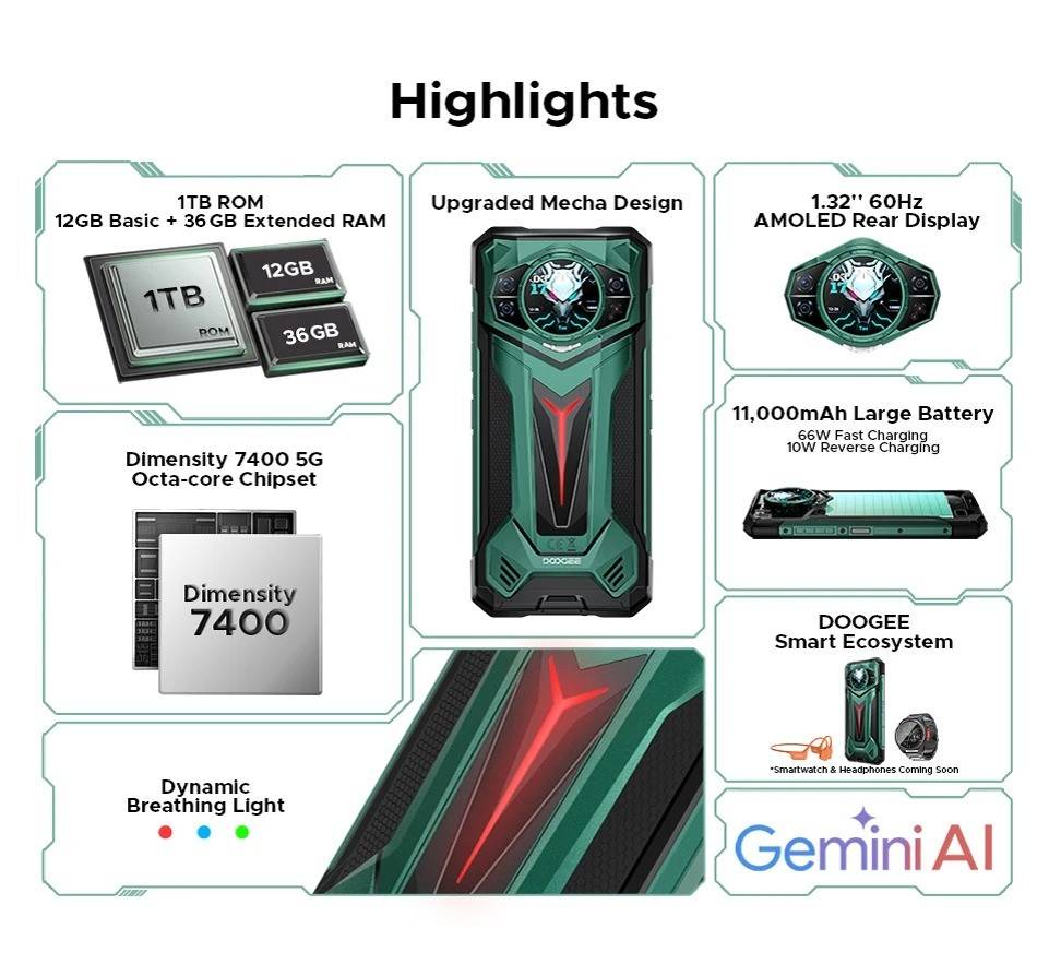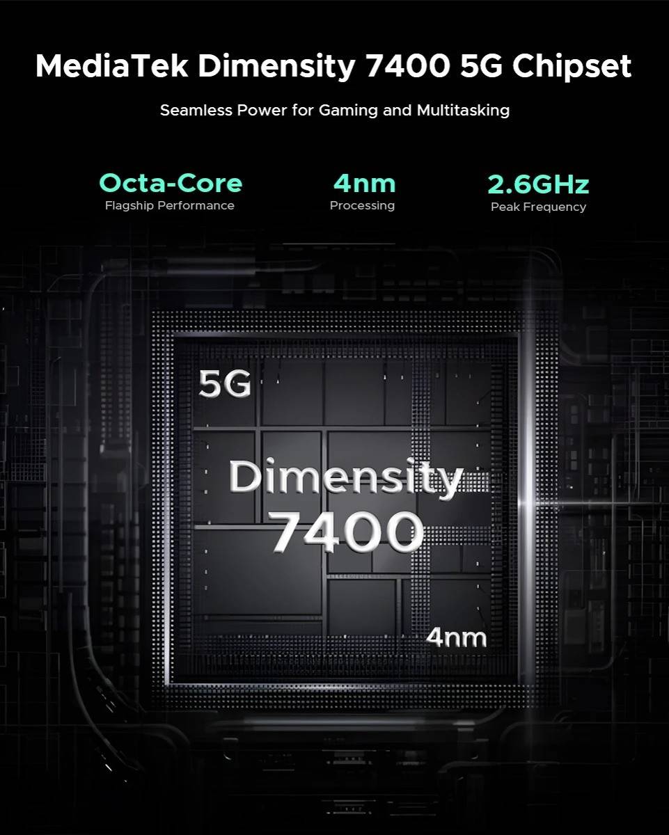 CPU:MediaTek Dimensity 7400/ 4nm / Octa Core / 2.6GHz Display:6.72" FHD+ 120Hz IPS Waterdrop screen Rear Display:1.32" AMOLED 60Hz multifunctional round rear display / 499 ppi Feature:LED light effect Rear Camera:100MP AI main camera+20MP Night vision camera+2MP Macro camera Front Camera:32MP Front Camera RAM & ROM:48GB RAM(12GB+Up to 36GB Extended RAM)+1TB ROM Max TF Card Capacity:2TB Battery capacity:11000mAh Large Battery / 66W Fast Charging/10W high power reverse charging OS:Android 15 Dimension & Weight:179.5*82.5*19.1mm & 383g SIM SIot:Support nano SIM + nano SIM or nano SIM card + TF card Wi-Fi:WiFi6E (802.11ax/ac/b/g/n) Navigation:GPS | Glonass | Galileo | Beidou | A-GPS L1+L5 Connectivity: NR:N1/N3/N7/N8/N28/N38/N41/N77/N78/N79 FDD:1/2/3/4/5/7/8/12/17/18/19/20/25/26/28AB/66 TDD:B34/38/39/40/41 WCDMA:B1/2/4/5/8 GSM: B2/3/5/8 Support EDGE/GPRS