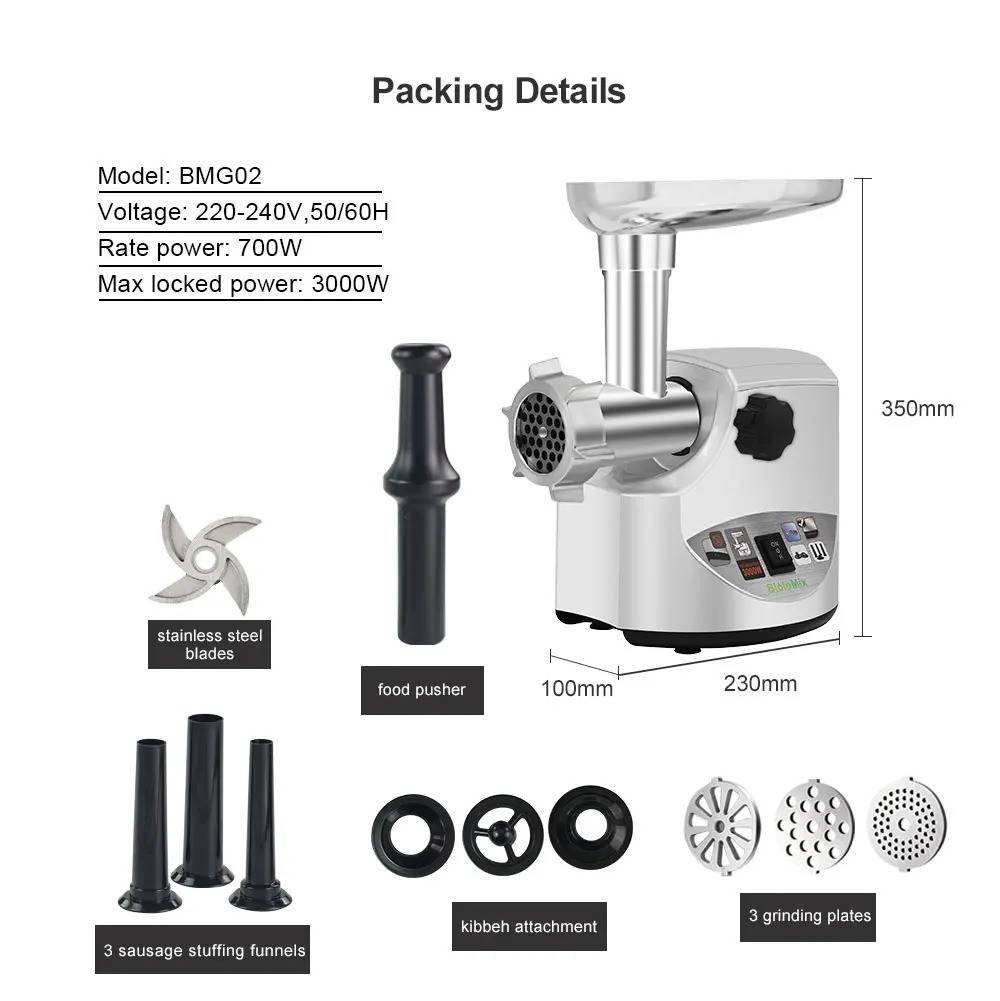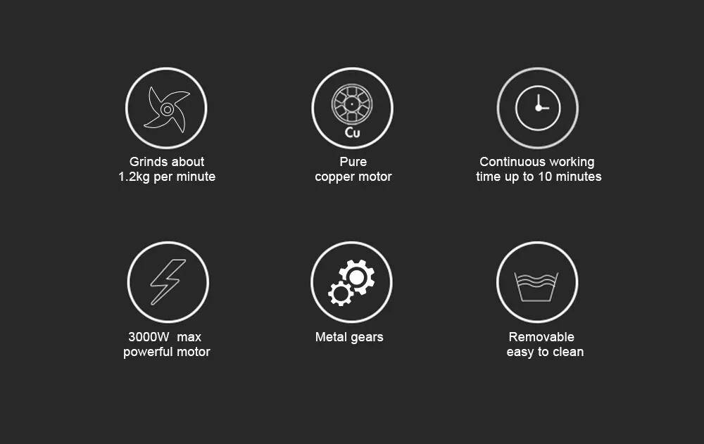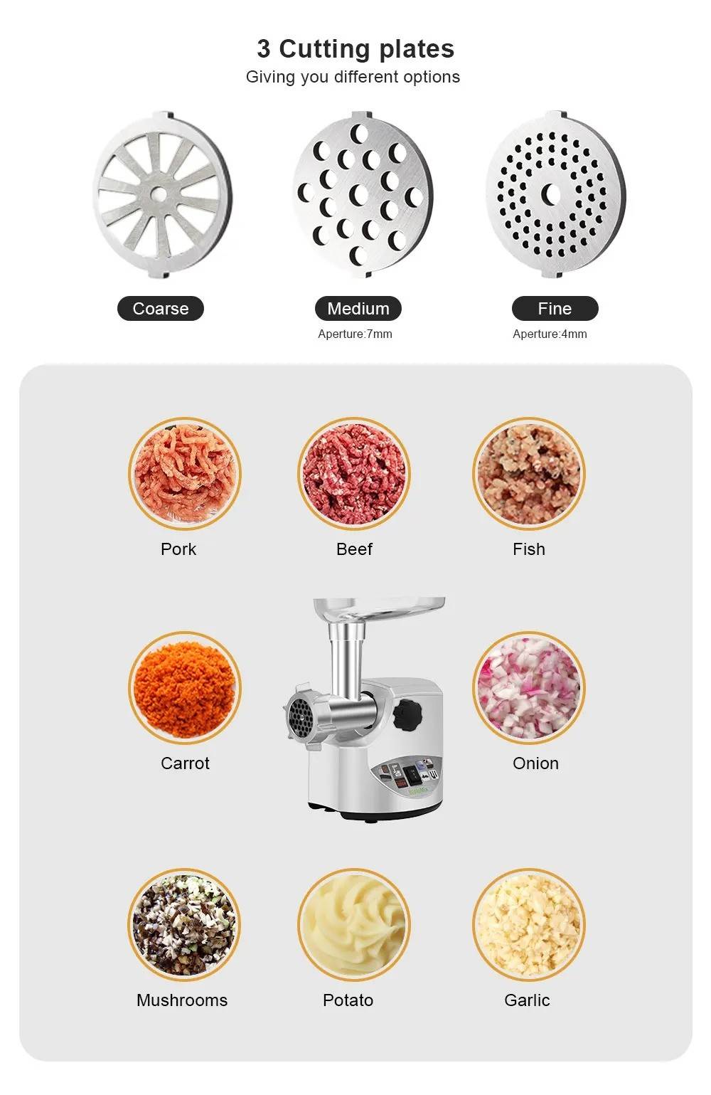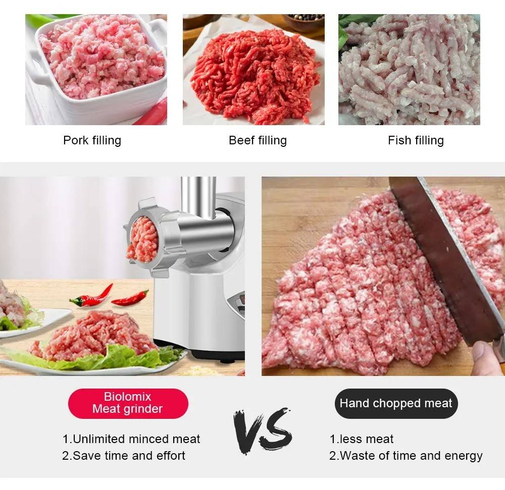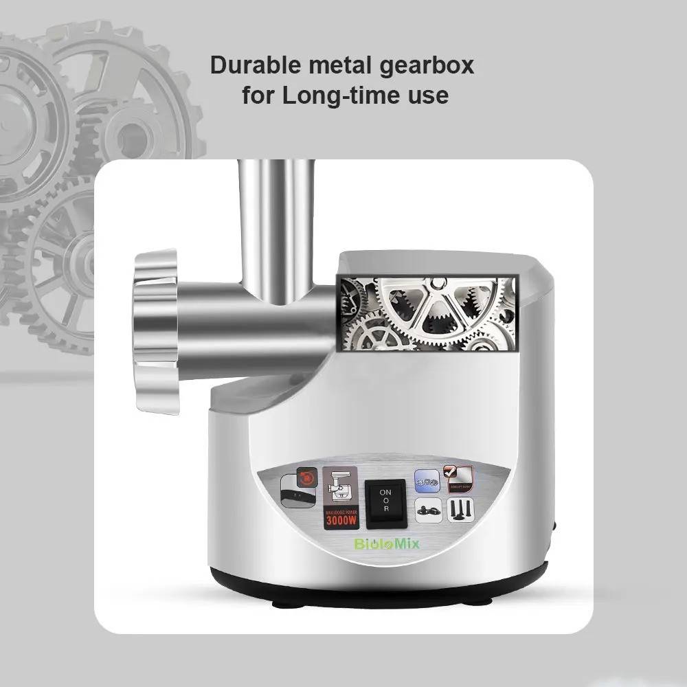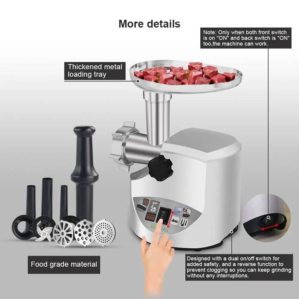 Fast grinding: this meat grinder has a peak power 3000W ( rated power 700W ) motor that grinds 1.2kg of meat per minute. The reverse function prevents clogging so you can keep grinding without any interruptions. For more tender results, some meats can be ground twice. However, fatty meats should only be ground once.