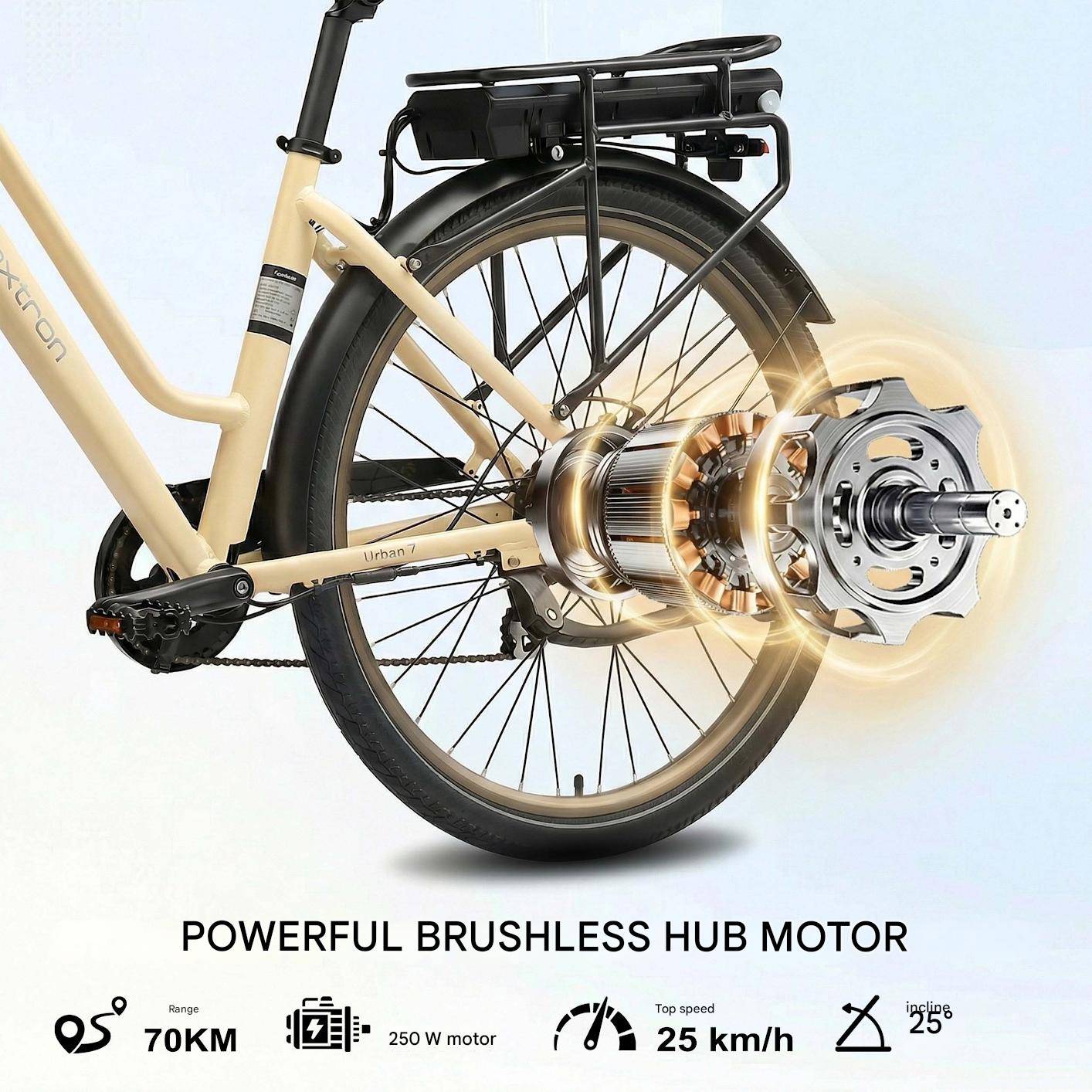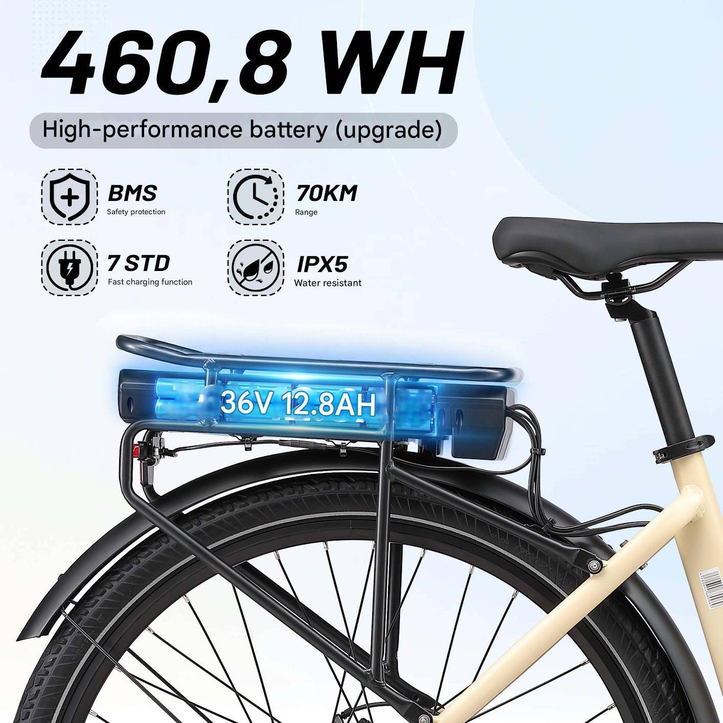 Long-range 36V lithium battery Equipped with a 36V 12.8Ah lithium battery with BMS protection, the Urban 7 offers a range of up to 70 km with pedal assist. The integrated battery maintains the bike's sleek look while providing reliable power for everyday travel.