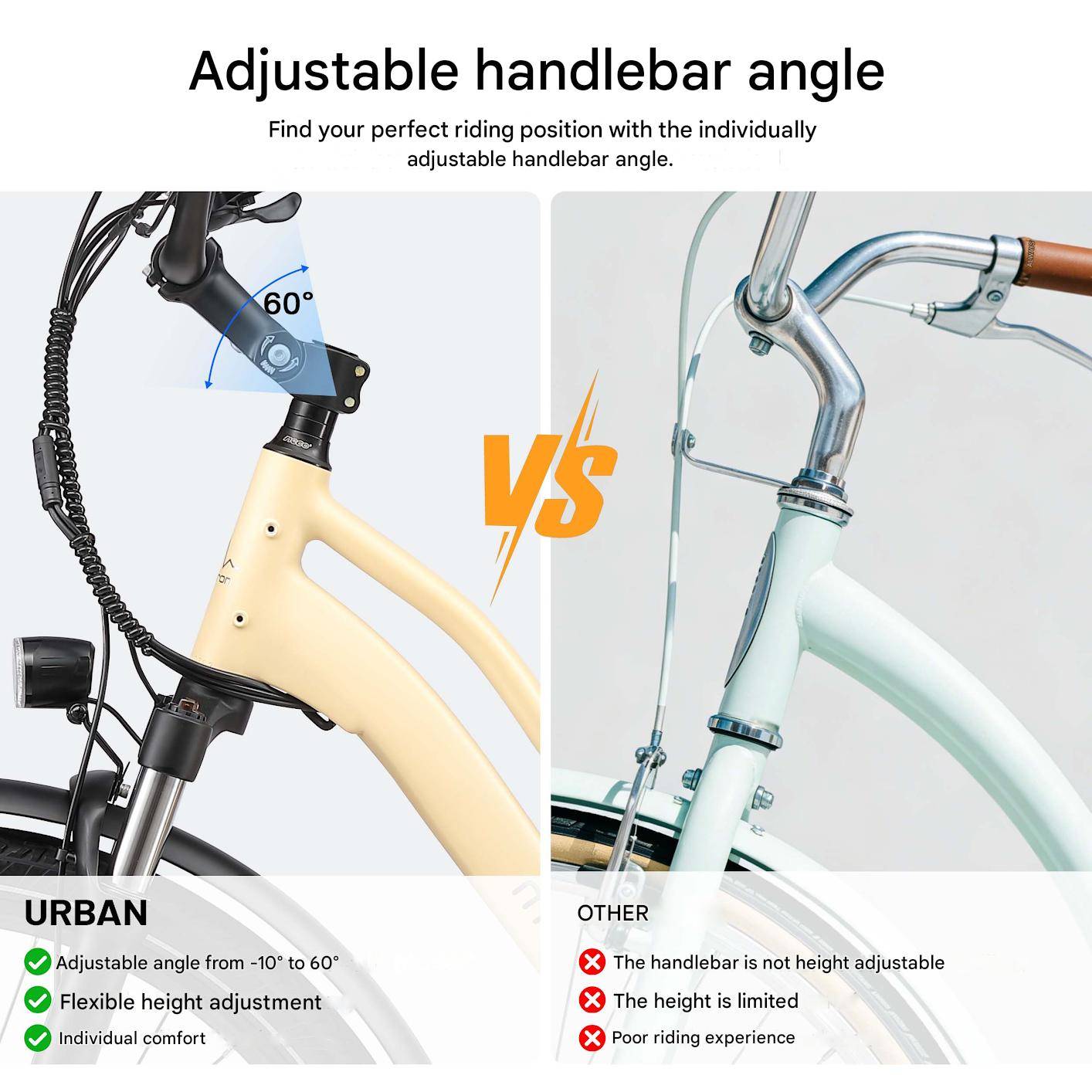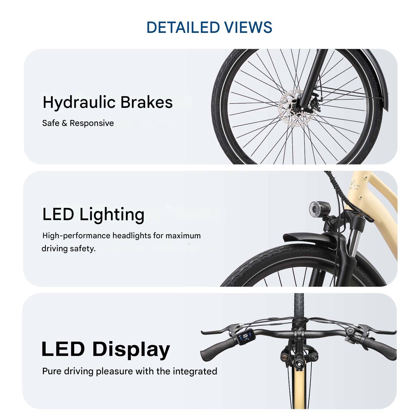 Safe braking and nighttime visibility Equipped with responsive disc brakes and powerful LED lighting, the Urban 7 ensures safe braking and enhanced visibility when riding in low light or at night.