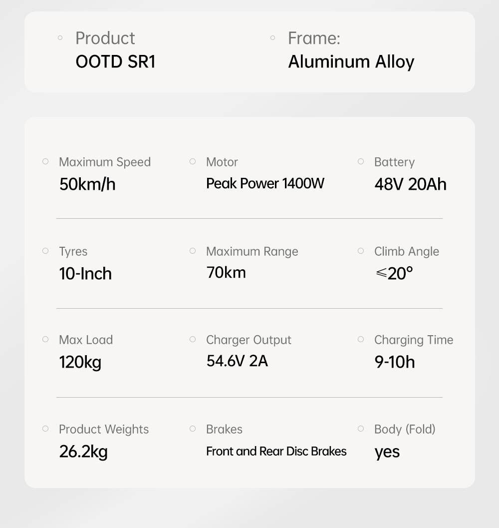 【EU Direct】OOTD SR1 Electric Scooter 1400W Motor 48V 20Ah Recommended Top Speed 25KM/H 10-Inch Tires 70KM Long Range Foldable E-Scooter Max Load 120KG