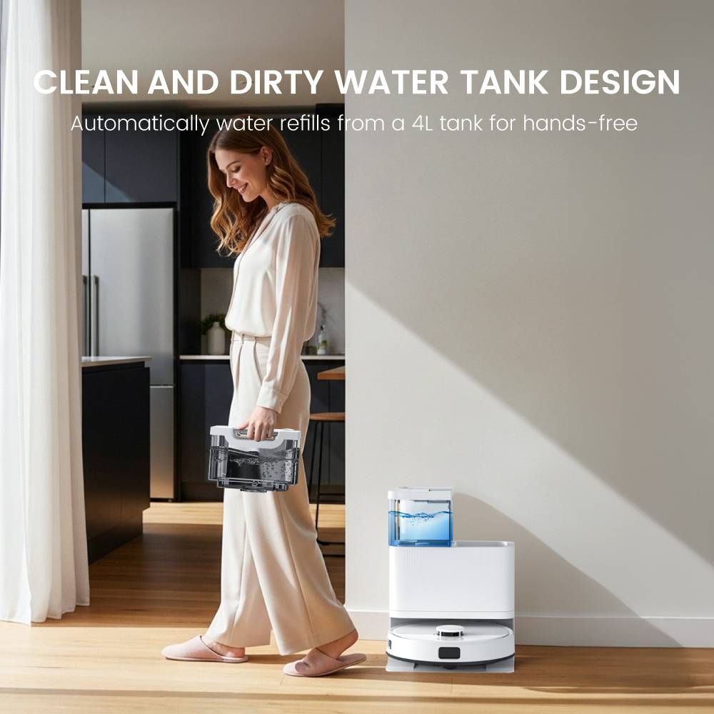 With a noise level between 62dB to 70dB, this robot vacuum works quietly, allowing you to watch TV, work, or sleep without disturbance. The compact design lets it slide under sofas, beds, and cabinets to clean hard-to-reach areas. The intuitive 2-in-1 dustbin and water tank design simplifies maintenance, while the construction ensures long-term reliable use—making it an ideal cleaning companion for modern families.