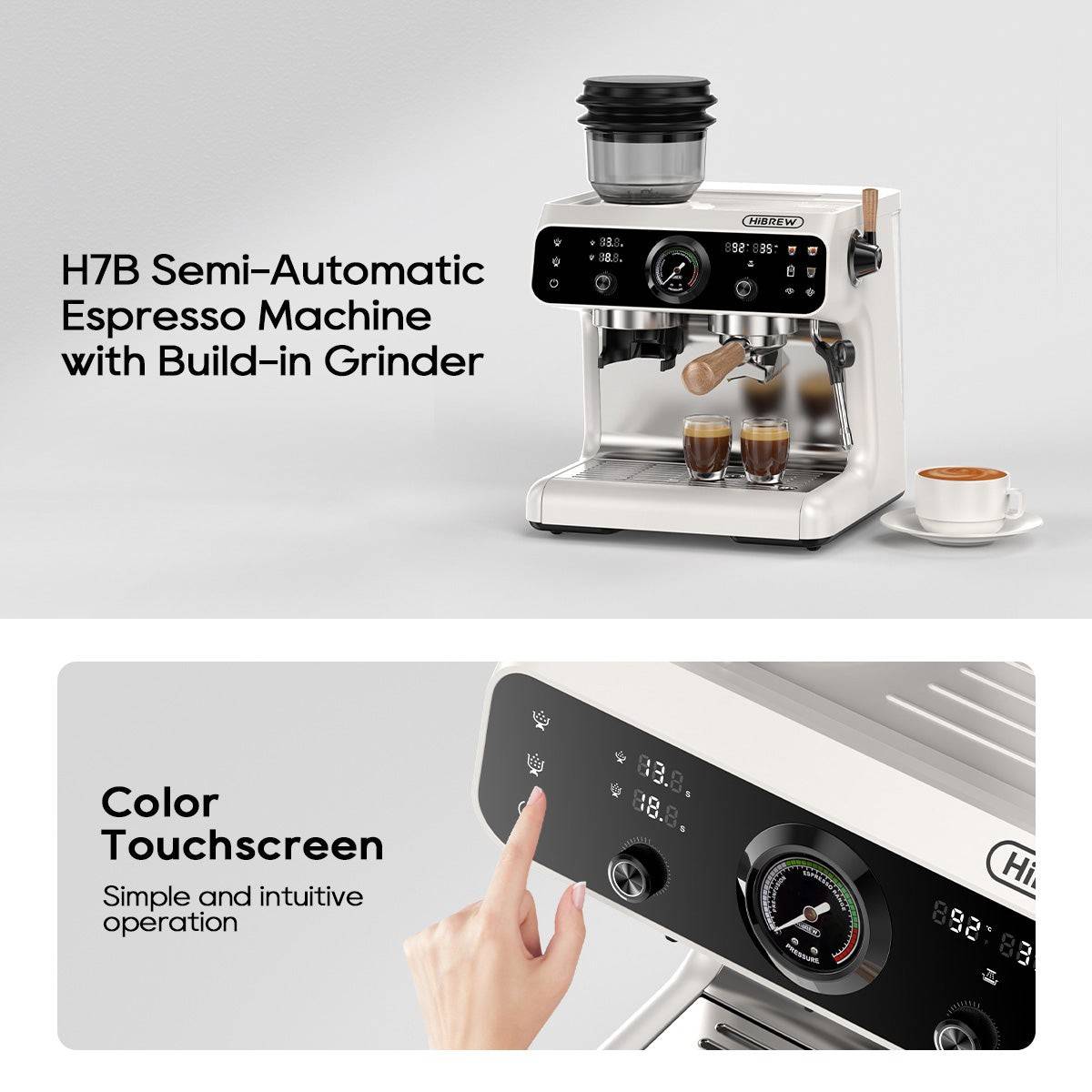 The H7B Semi-Automatic Espresso Machine combines professional performance with effortless operation. Featuring a built-in grinder and a vibrant color touchscreen, it brings precision and simplicity to your daily coffee ritual. Whether you’re a beginner or a seasoned coffee enthusiast, the H7B helps you brew rich, aromatic espresso with just a touch.