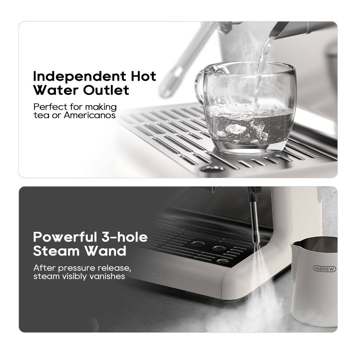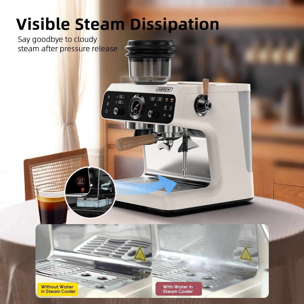 Ever notice how steam lingers in the air after frothing, creating a cloudy mess? With HiBREW’s advanced pressure release system, that’s a thing of the past. Our innovative technology ensures steam dissipates visibly and instantly—leaving your kitchen clear and your mind even clearer.