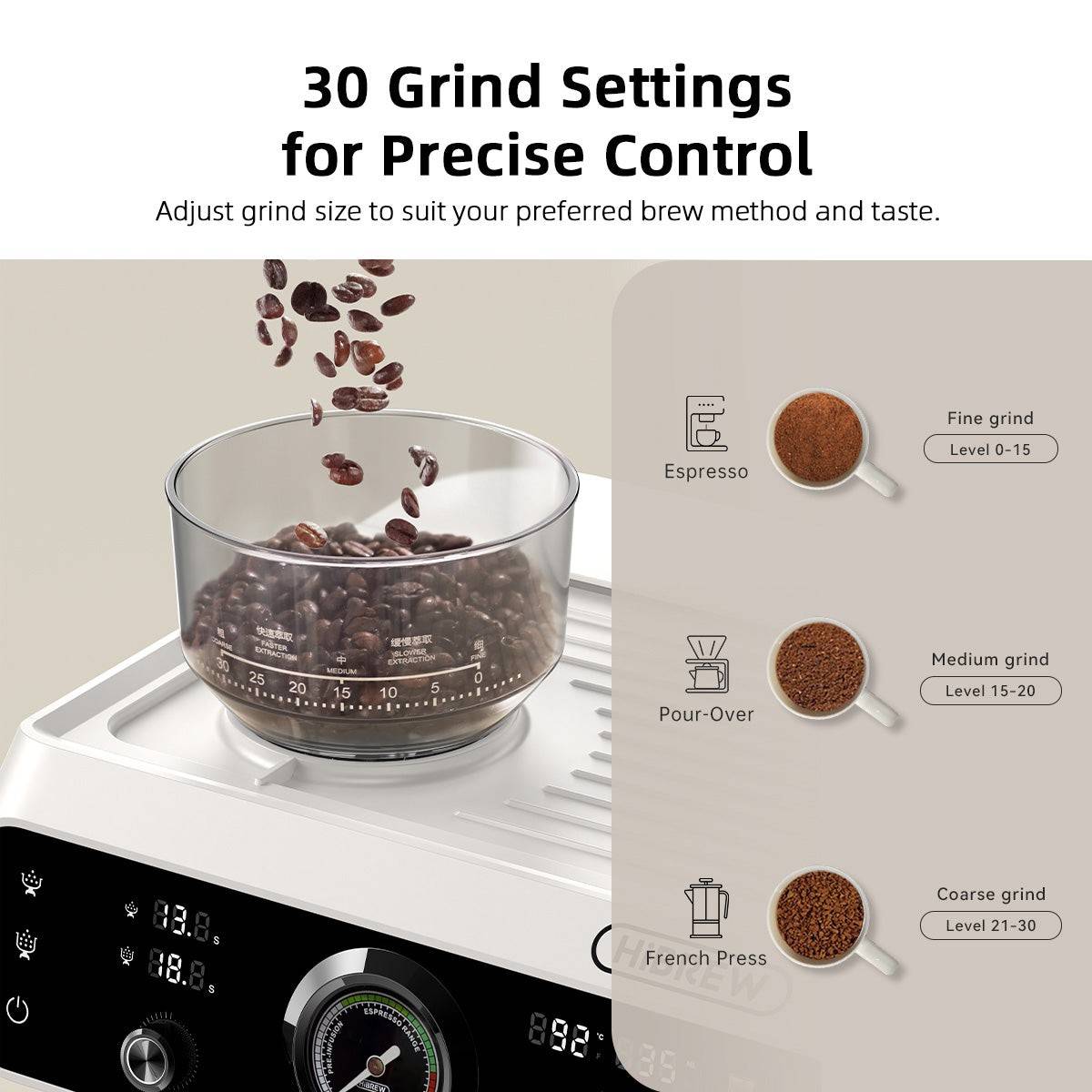 With30 precise grind settings, the HIBREW grinder gives you full control over extraction and flavor. From ultra-fine espresso to coarse French Press—unlock the full potential of your beans and brew exactly how you like it.