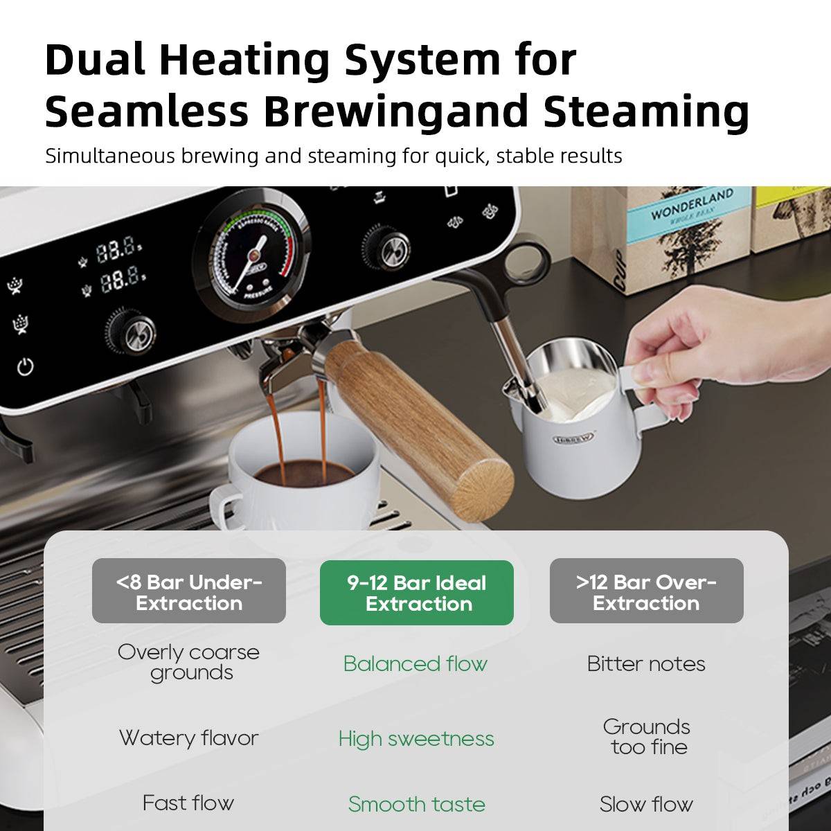 Dual Heating System: Brew and Steam Simultaneously. No Waiting.