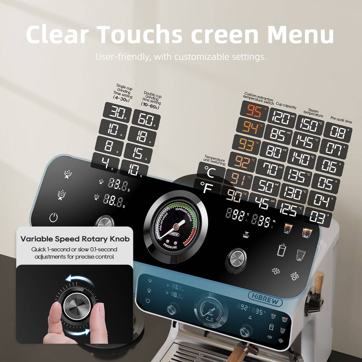 Take command of your coffee craft with an interface designed for clarity, customization, and precision. The HiBREW combines a vibrant touchscreen with a responsive variable speed knob, putting café-level control right at your fingertips.