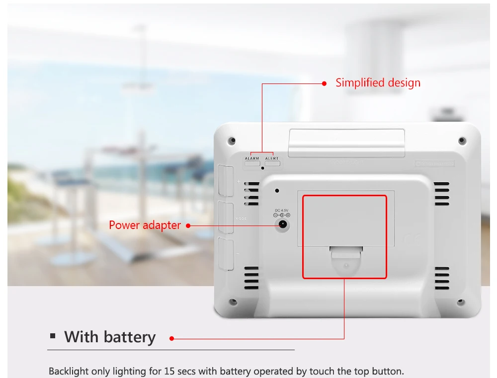 •One easy set daily alarm with snooze function. When the alarm is ring, presses any button except the "SNOOZE/LIGHT" button to stop the alarm clock. If touch "SNOOZE/LIGHT" button, the alarm mode will get to SNOOZE mode. The alarm signal will sounds again after 5 minute