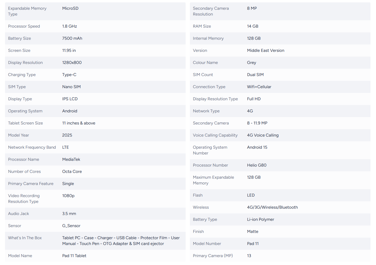 G-Tab Pad 11 10.95" Android 15 Tablet – 128GB ROM, 4G LTE Data & Calling, 14GB (6+8) RAM, 7500mAh Battery, Dual Camera, Case & Touch Pen Included – Fast 90Hz Display, OTG Adapter, SIM Support
