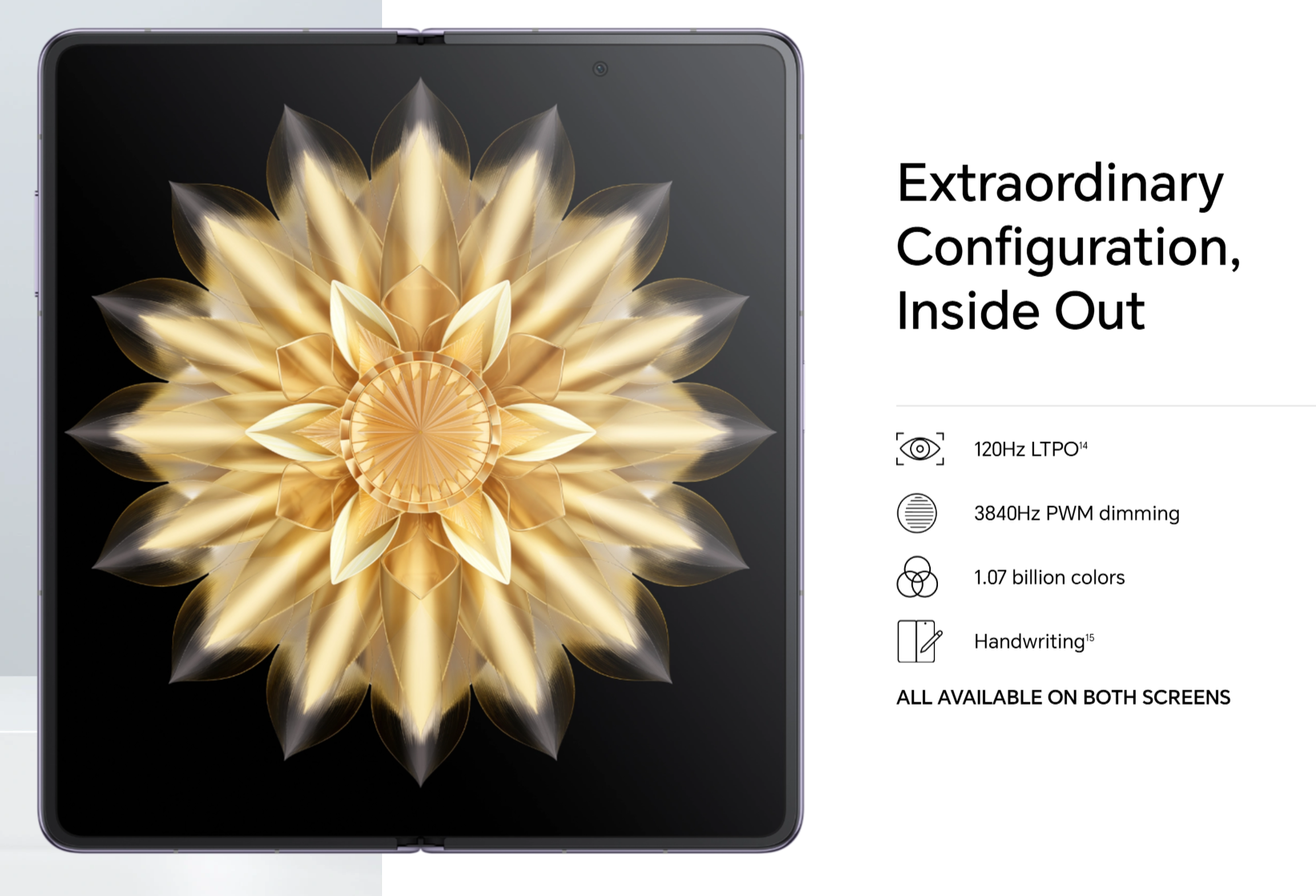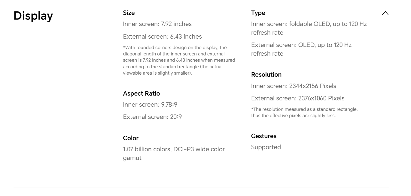 Screen: 7.92" Foldable LTPO OLED, (2156 x 2344 pixels) 120HZ HDR10+ Display
