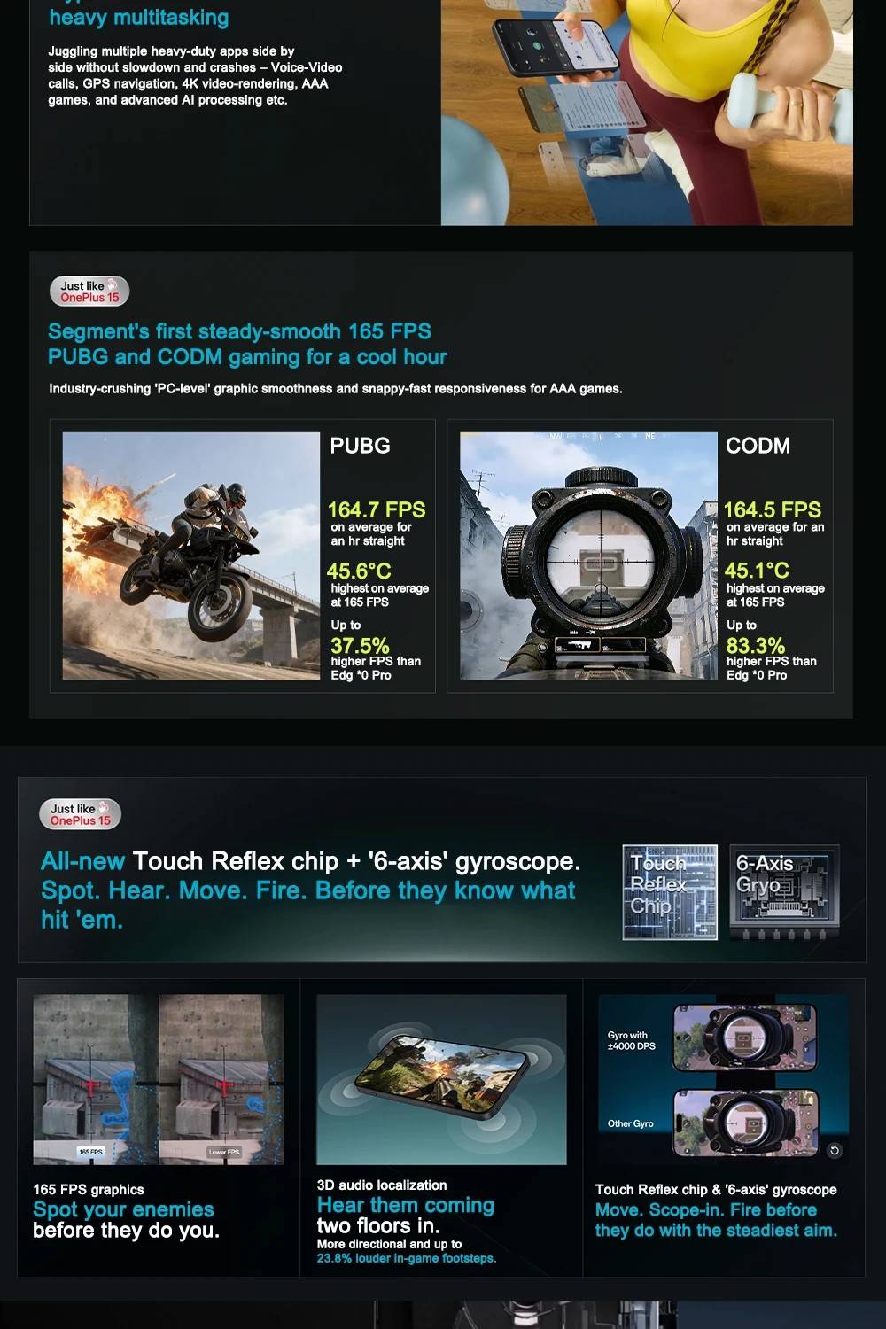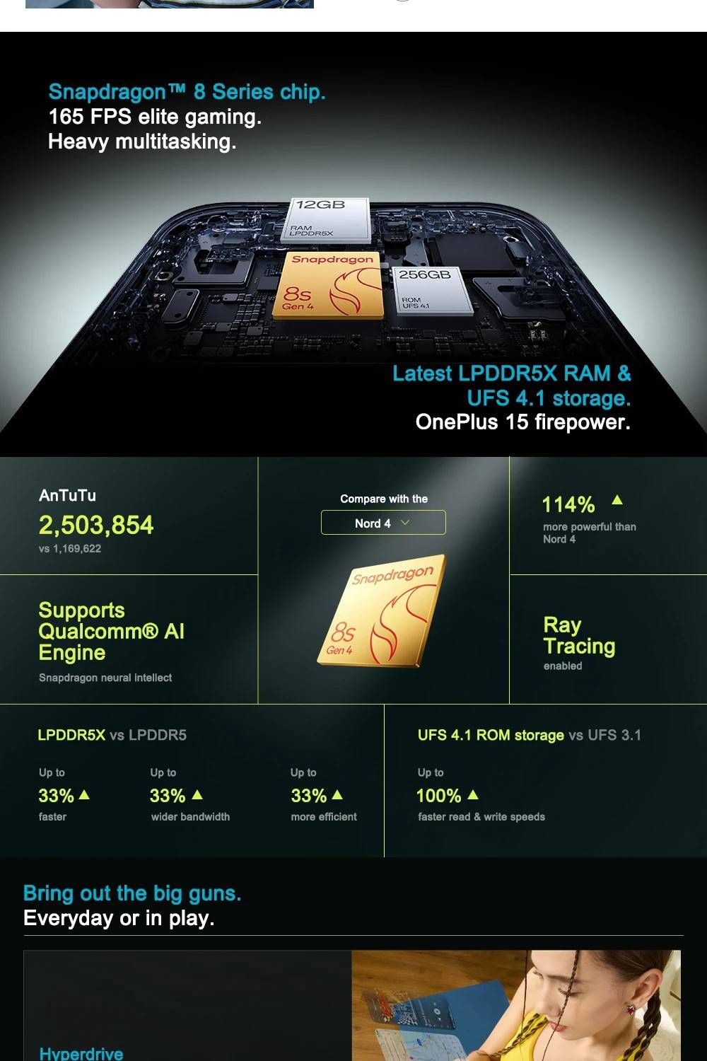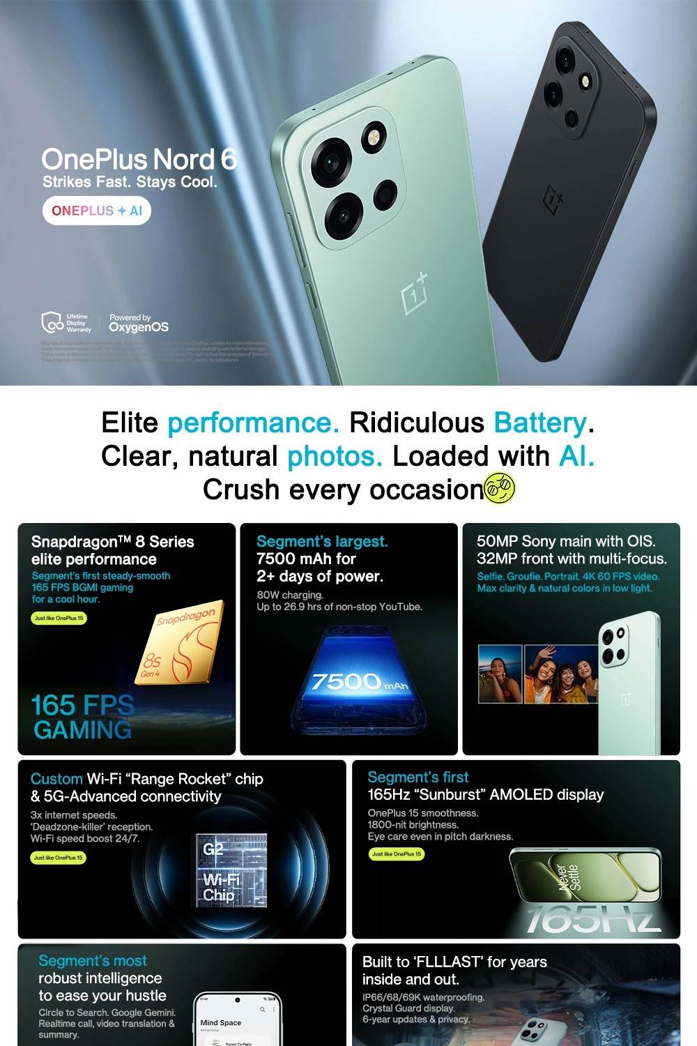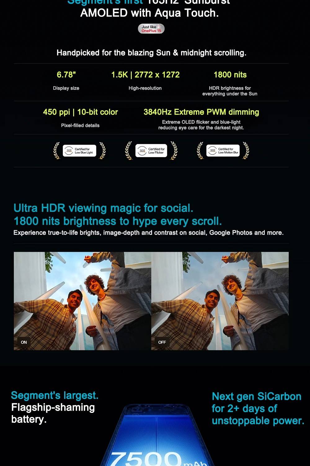 Processor:Qualcomm® Snapdragon™ 8s Gen 4 Mobile Platform GPU:Qualcomm® Adreno™ 825 RAM + ROM:8G+256GB,12G+512GB Display:6.78'' ,1.5K (FHD+), 2772 x 1272,Up to 165Hz Rate Battery:7500 mAh (non-removable),Supports 80W SUPERVOOC Charging Camera:50MP Main Camera,8MP Ultra-Wide,OIS,EIS OS :OxygenOS 16.0 based on Android™ 16 NFC:Supported IP 'Dust-water resistance' rating:IP66, IP68, IP69, IP69K Others:Bluetooth 6,In-display Fingerprint Sensor,GPS, GLONASS, BDS, Galileo, QZSS SIM:Dual Nano-SIM Bands: GSM: 850/900/1800/1900MHz WCDMA: Bands 1/2/4/5/8 LTE-FDD: Bands 1/2/3/4/5/7/8/12/17/18/19/20/26/28/32/66 LTE-TDD:Bands 38/39/40/41/42/48 5G NR: n1/n2/n3/n5/n7/n8/n12/n20/n28/n38/n40/n41/n48/n66/n75/n77/n78 *Network connectivity may vary depending on carrier’s network and related service deployment.