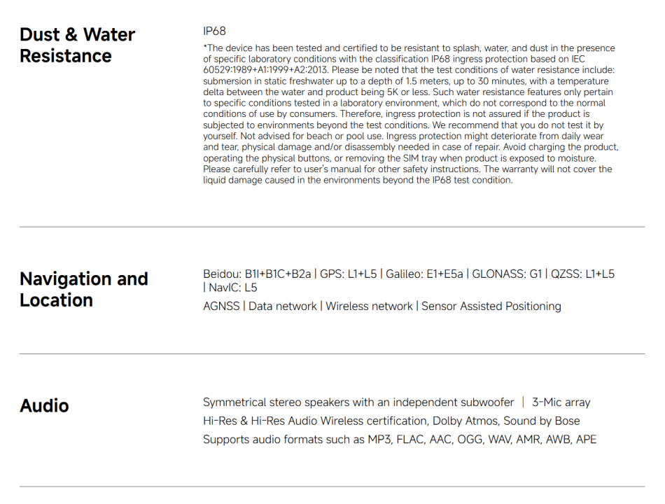 AI Face Unlock,IP68 dust and water protection, Triple speakers, Hi-Res & Hi-Res Audio Wireless certification, Dolby Atmos®, Sound by Bose Other --------NFC,Wi-Fi 7, Bluetooth 6.0, GPS