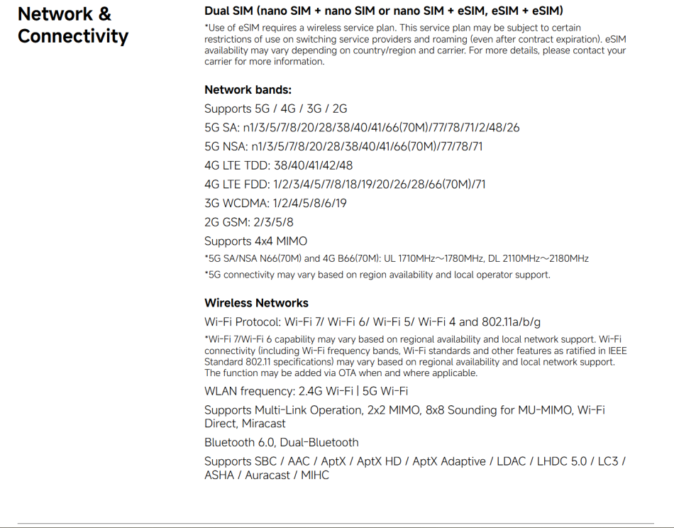 Network:Dual SlM (nano SlM + nano SlM or nano SIM+eSIM or eSIM+eSIM) Network band: Supports 5G/4G/3G/2G -5G SA:n1/3/5/7/8/20/28/38/40/41/66(70M)/77/78/71/2/48/26 -5G NSA:n1/3/5/7/8/20/28/38/40/41/66(70M)/77/78/71 -4G LTE TDD:38/40/41/42/48 -4G LTE FDD:1/2/3/4/5/7/8/18/19/20/26/28/66(70M)/71 -3G WCDMA:1/2/4/5/6/8/19 -2G GSM:2/3/5/8 Supports 4x4 MIMO *5G SA/NSA N66(70M) and 4G B66(70M):UL 1710MHz~1780MHz, DL 2110MHz~2180MHz *5G connectivity may vary based on region availability and local operator support.