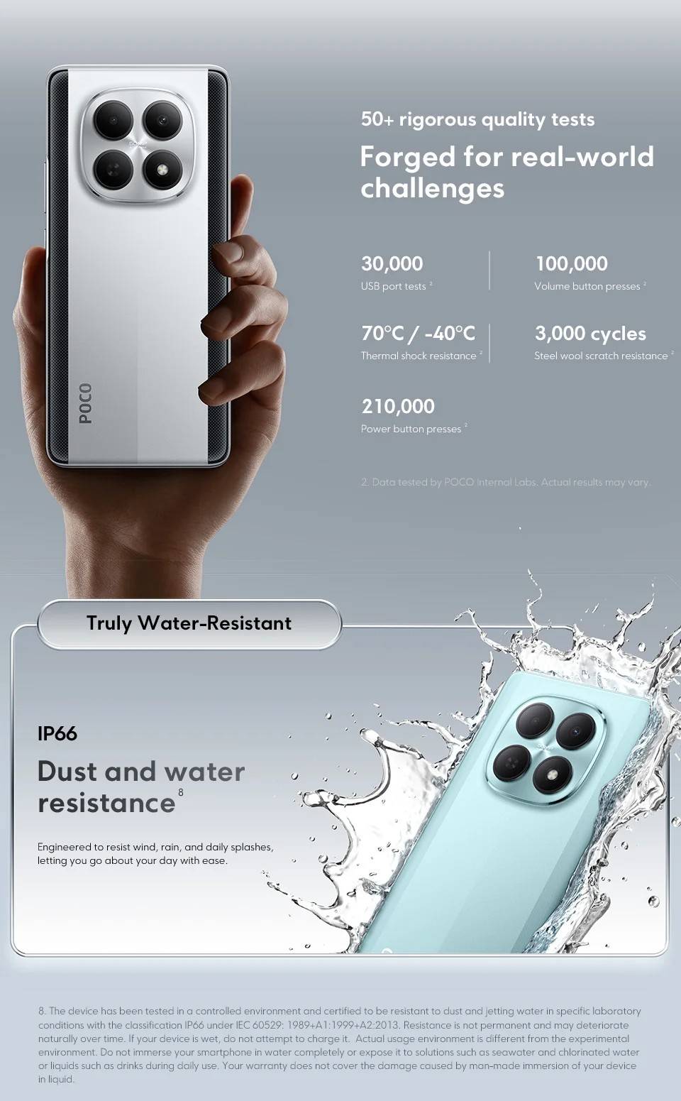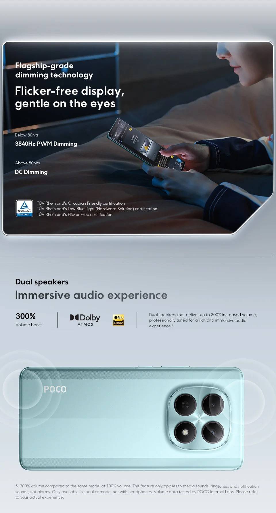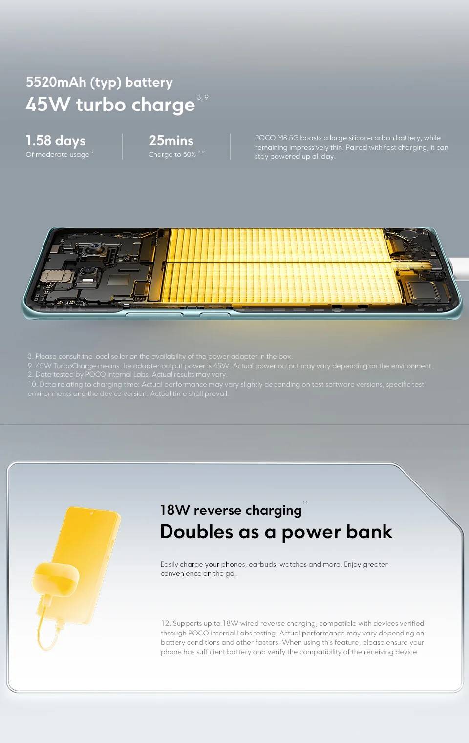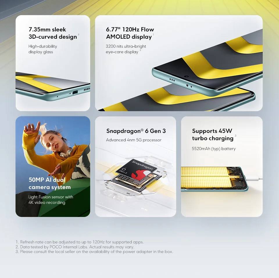 POCO M8 5G----- Snapdragon® 6 Gen 3 Octa-core, up to 2.4GHz RAM+ROM ------- 8GB+256GB | 8GB+512GB Screen ------------6.77" Flow AMOLED display, Resolution: 2392 x 1080, 120Hz refresh rate Battery ----------- 5520mAh (typ) battery, 45W turbo charging Camera -----------50MP main camera, 2MP depth camera, 20MP front camera OS ----------------Global Version, Support Multi-Language and Google Play, In-screen fingerprint sensor, AI Face Unlock, Powered by Xiaomi HyperOS 2 Other ------------ NFC , Wi-Fi, Bluetooth 5.1, Dolby Atmos® | Hi-Res Network & Connectivity ------- nano SIM 1 + Hybrid (nano SIM or microSD) Supports 5G / 4G / 3G / 2G 2G: GSM: B2/3/5/8 3G: WCDMA::B1/2/4/5/6/8/19 4G: LTE FDD: B1/2/3/4/5/7/8/18/19/20/26/28/66/71 4G: LTE TDD: B38/40/41/42/48 5G: n1/3/5/7/8/20/28/38/40/41/48/66/77/78/71/2