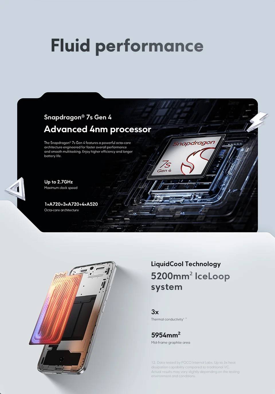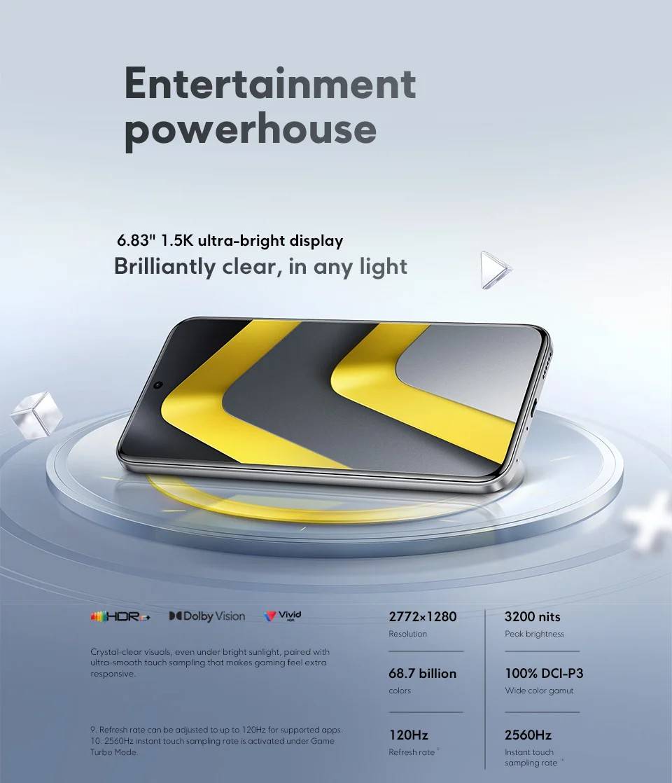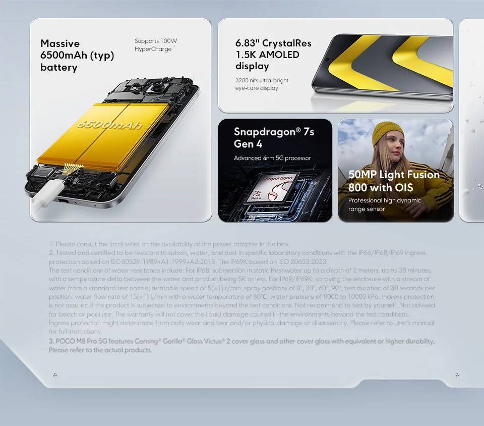 CPU ------------- Snapdragon® 7s Gen 4 Octa-core processor, up to 2.7GHz, Advanced 4nm 5G processor RAM+ROM ---- 8GB+256GB | 12GB+512GB Screen ---------- 6.83" CrystalRes 1.5K AMOLED display, Resolution:2772×1280, 120Hz refresh rate Battery --------- 6500mAh (typ) battery, Supports 100W HyperCharge (22.5W wired reverse charging) Camera -------- 50MP main camera, 8MP ultra-wide camera, 32MP front camera OS -------------- Global Version, Support Multi-Language and Google Play, In-screen fingerprint sensor, AI Face Unlock, Powered by Xiaomi HyperOS 2 Other ----------- NFC , Wi-Fi, Bluetooth 5.4, Dolby Atmos® | Hi-Res Network & Connectivity ------- Dual SIM (nano SIM 1 + nano SIM 2) Supports 5G / 4G / 3G / 2G 2G: GSM: 2/3/5/8 3G: WCDMA: B1/2/4/5/6/8/19 4G: LTE FDD: B1/2/3/4/5/7/8/18/19/20/26/28/66*/71 4G: LTE TDD: B38/40/41/42/48 5G: n1/2/3/5/7/8/20/26/28/38/40/41/48/66*/71/77/78 *B66/n66 supports 70MHz narrowband frequency