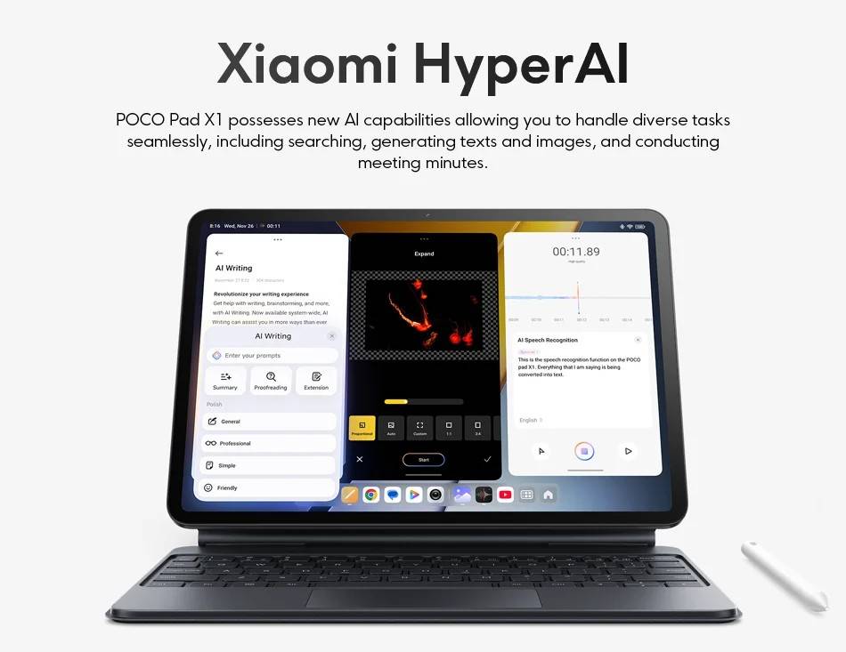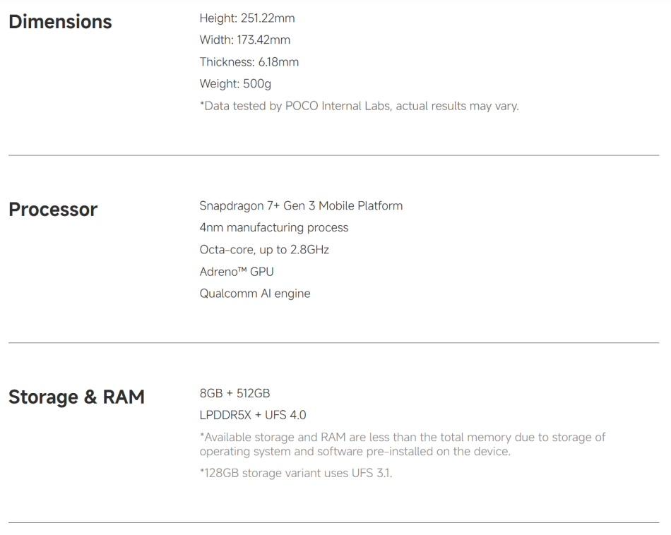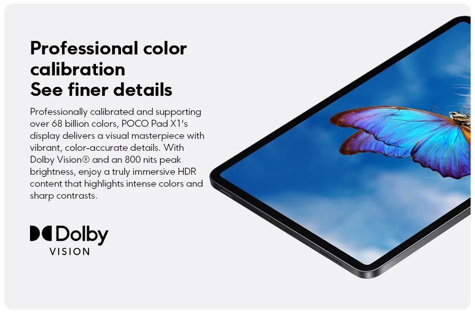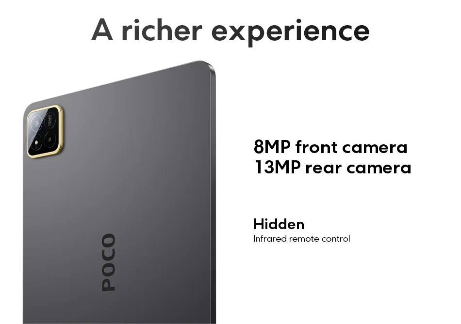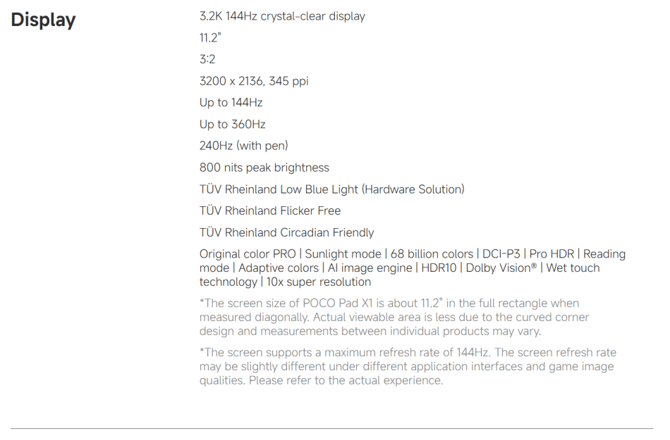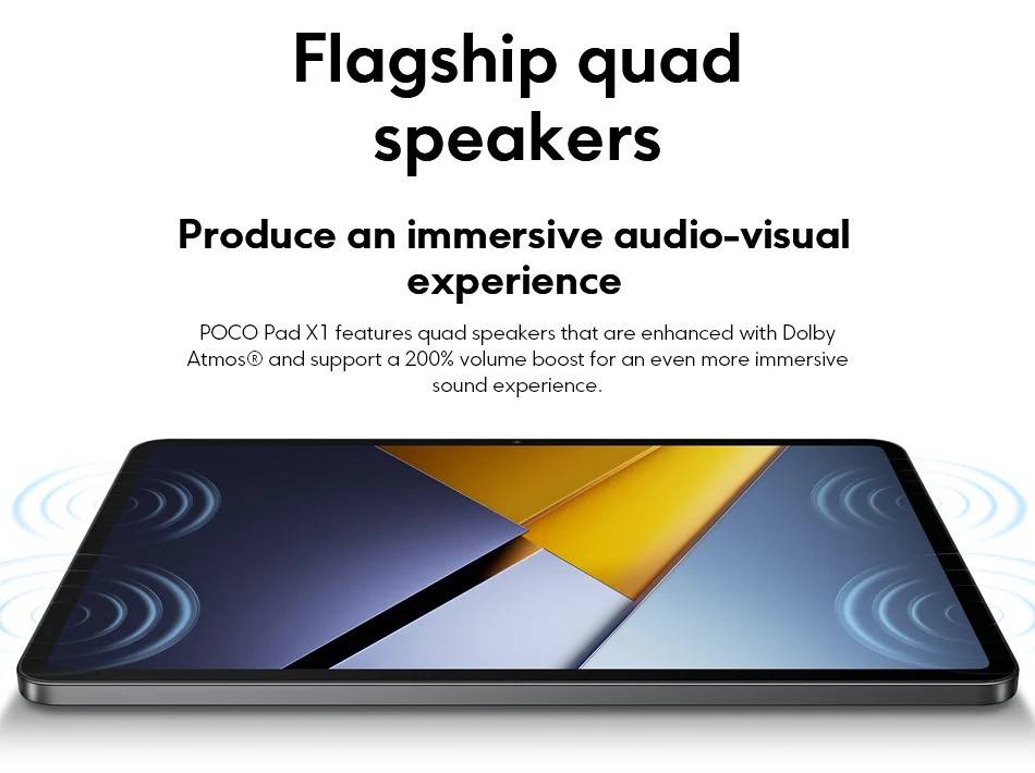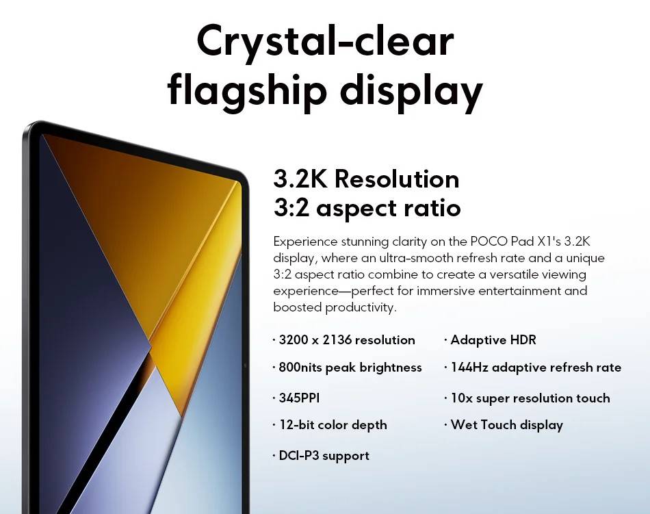 POCO Pad X1 -------------- Snapdragon 7+ Gen 3 Octa Core, Up to 2.8GHz (Adreno) Screen---------- 11.2-inch 3.2K 144Hz Crystal-clear Screen, 3200x2136 Resolution, 345 ppi, 800 nits Peak Brightness RAM+ROM---- 8GB+512GB (LPDDR5X + UFS 4.0) Camera--------- 13MP Rear Camera, 8MP Front Camera Battery--------- 8850mAh(Typ), 45W Turbo Charging OS---------------Xiaomi HyperOS 2,Support Google Play,Multi-Language and OTA Update Sensors---------Accelerometer | Gyroscope | Front Ambient light(color temperature) sensor | Rear Ambient light sensor Flicker sensor | Hall sensor | Magnetic sensor | Proximity sensor | RGB LED | IR remote control