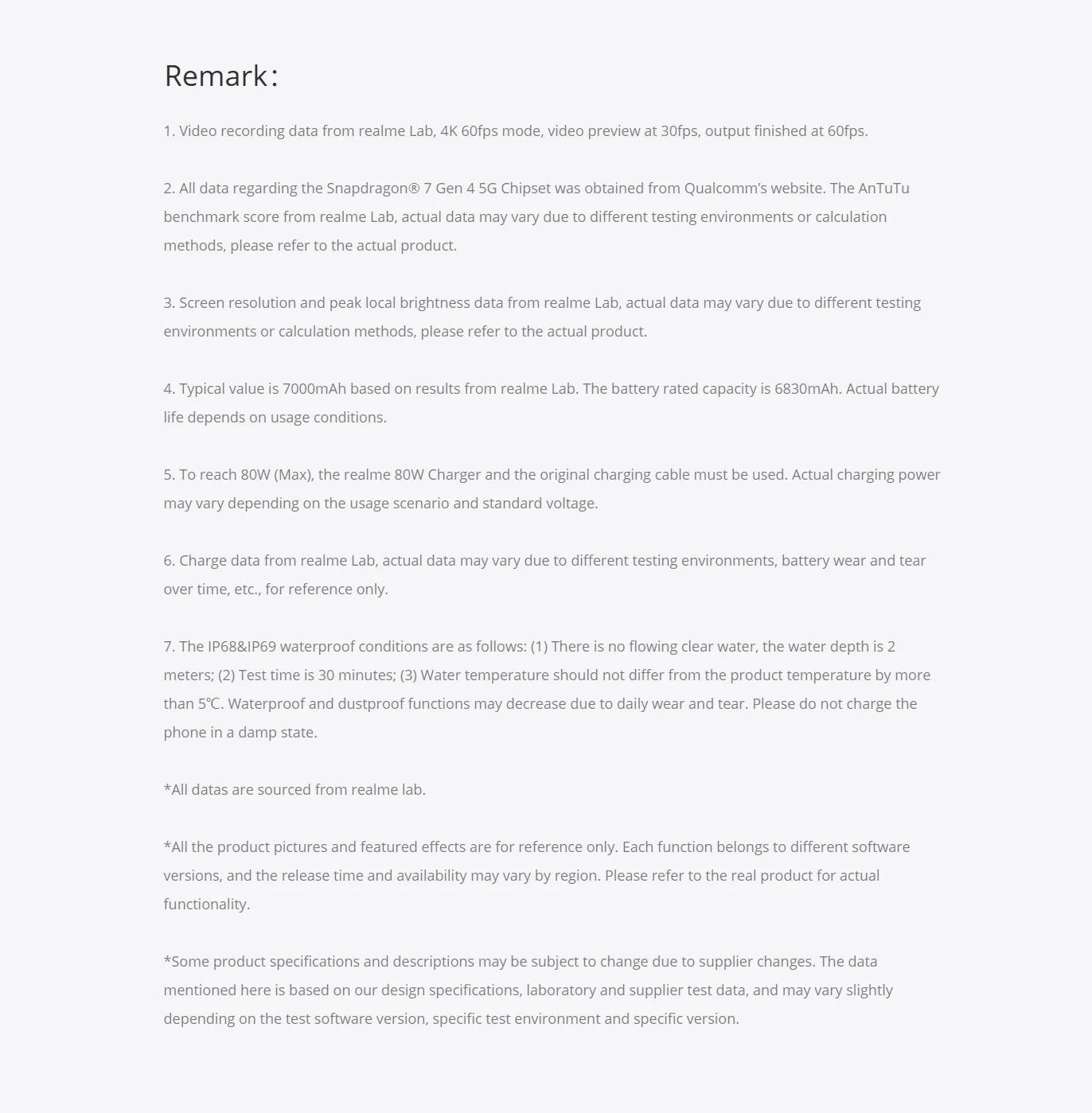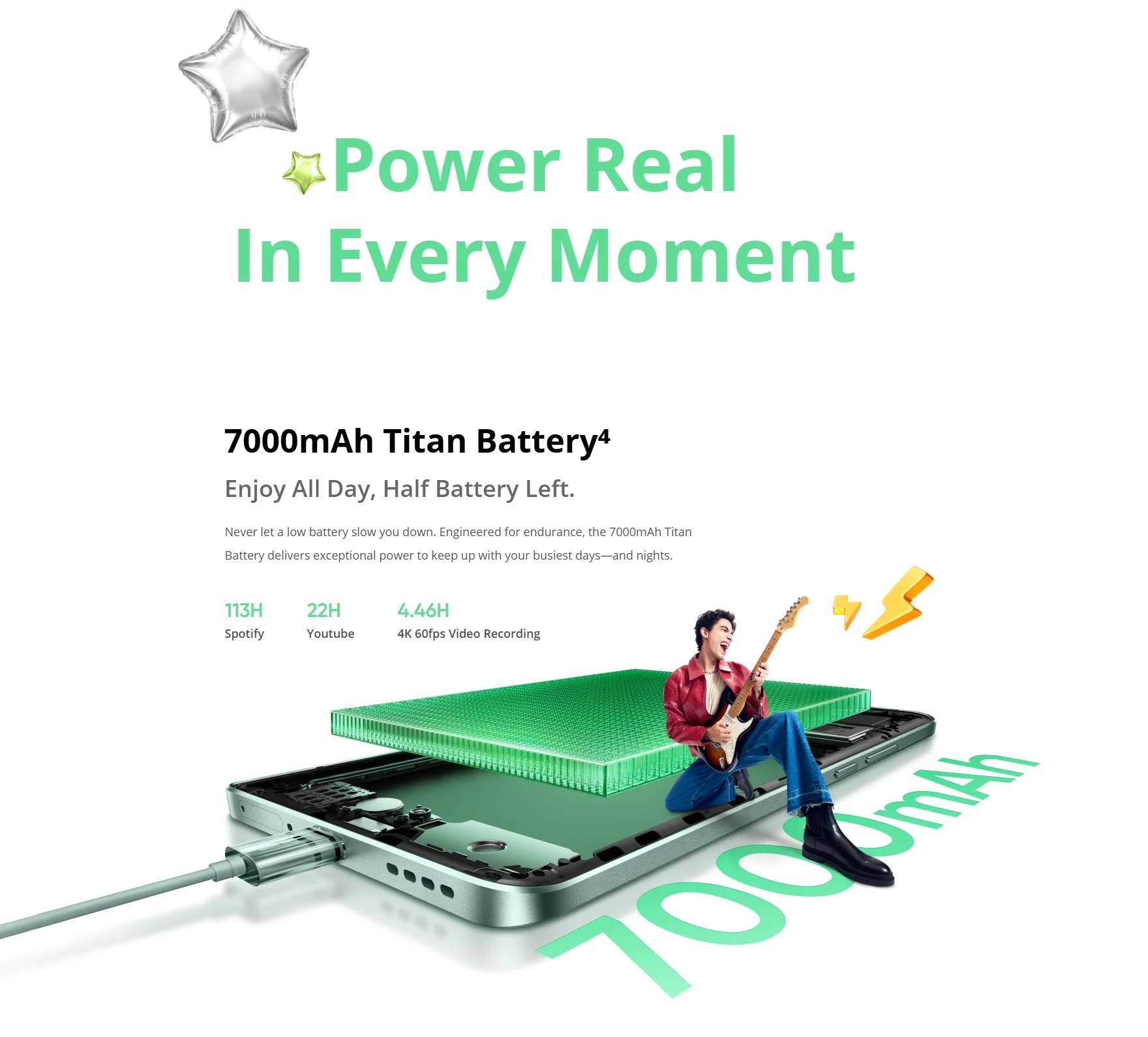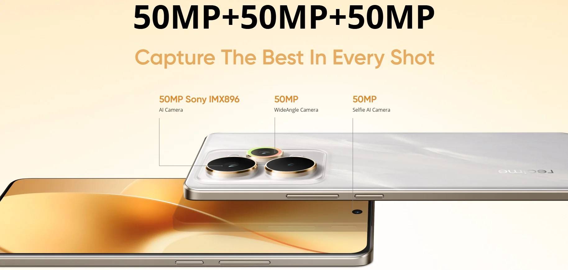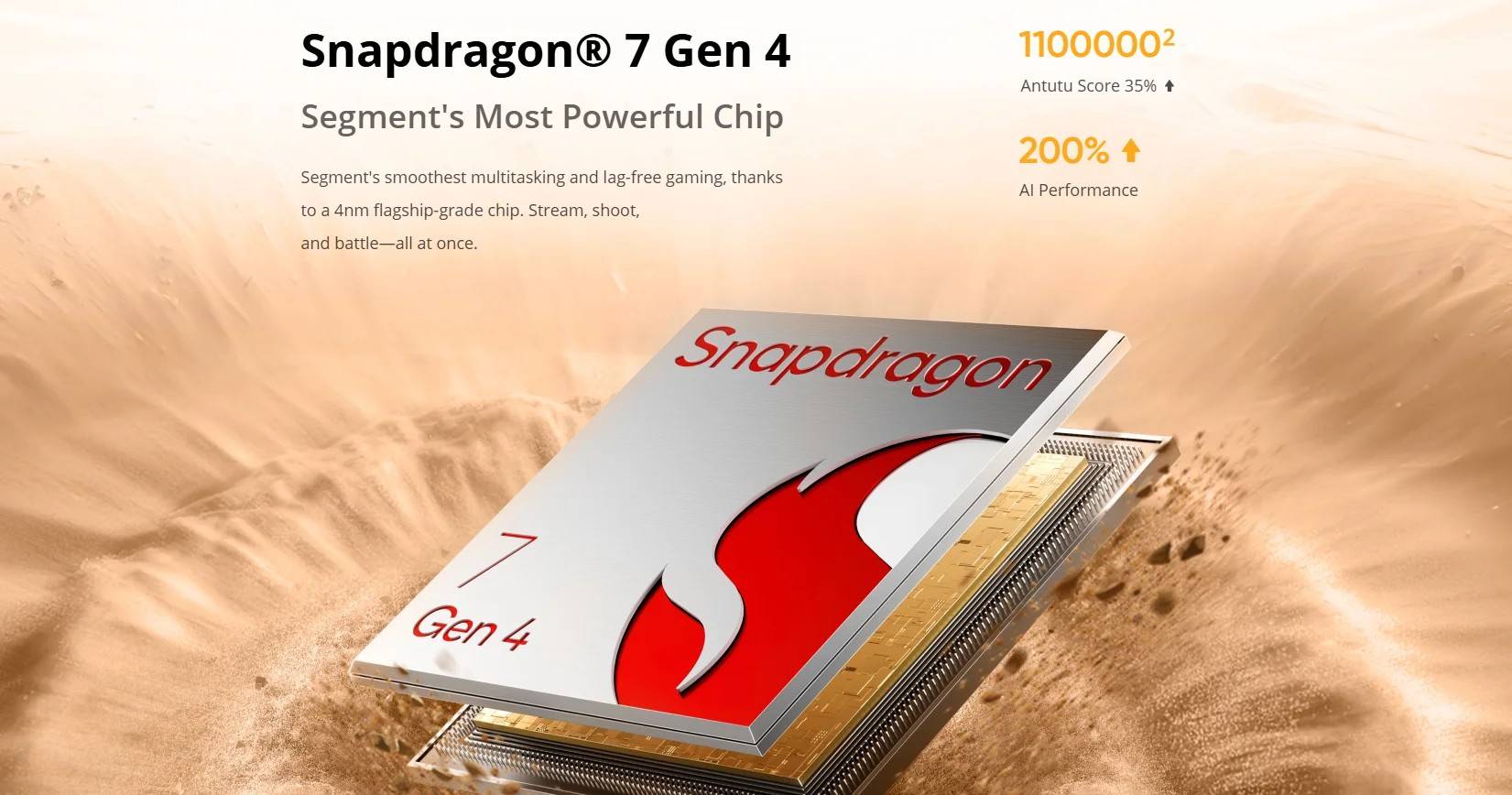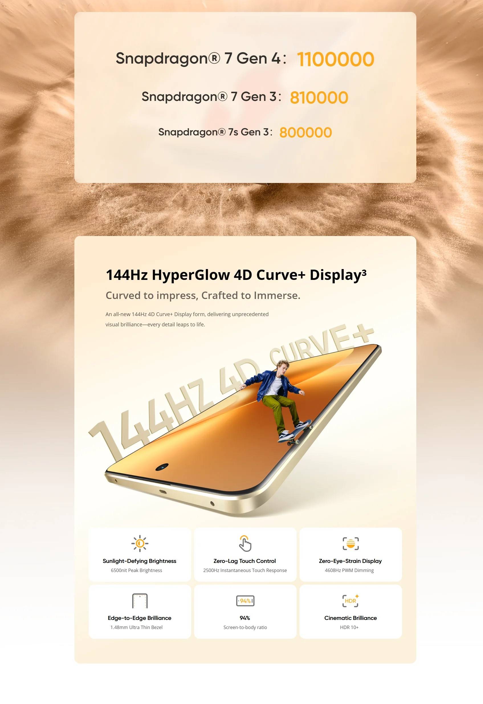 Processor ------- Qualcomm Snapdragon®7 Gen 4 Mobile Platform, 4nm Process, Octa-core Screen------------ 6.8 inches 144Hz HyperGlow 4D Curve+ Display, 1280*2800 Resolution, 1800nit(HBM)/ 6500nit Peak Brightness OS----------------- realme UI 6.0 Based on Android 15 Rear Camera --- 50MP Sony IMX896 OIS Camera + 50M Ultra Wide Angle Camera Front Camera -- 50M Front Camera Battery----------- 7000mAh (typ) Massive Battery, 6830mAh(min) Battery Capacity, 80W Ultra Charge Features--------- Support Wi-Fi 5 / Wi-Fi 6, Bluetooth 5.4, AI Party Mode, AI Edit Genie