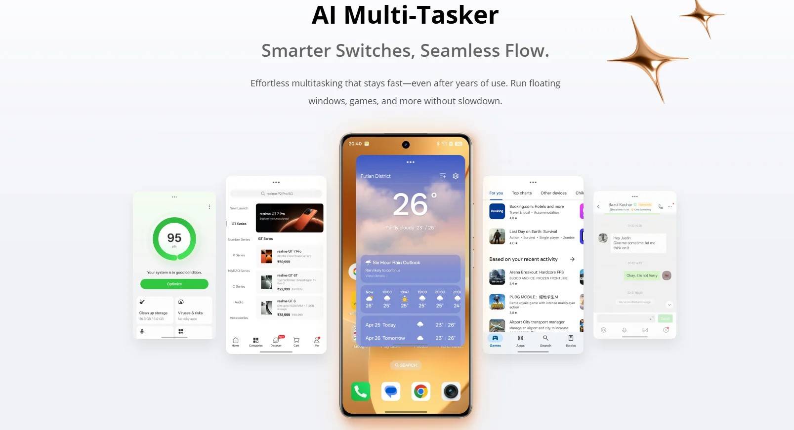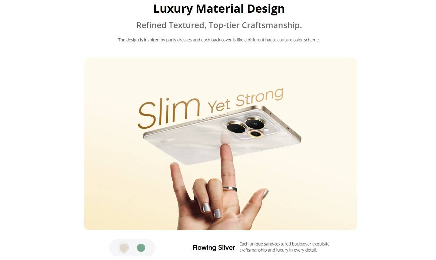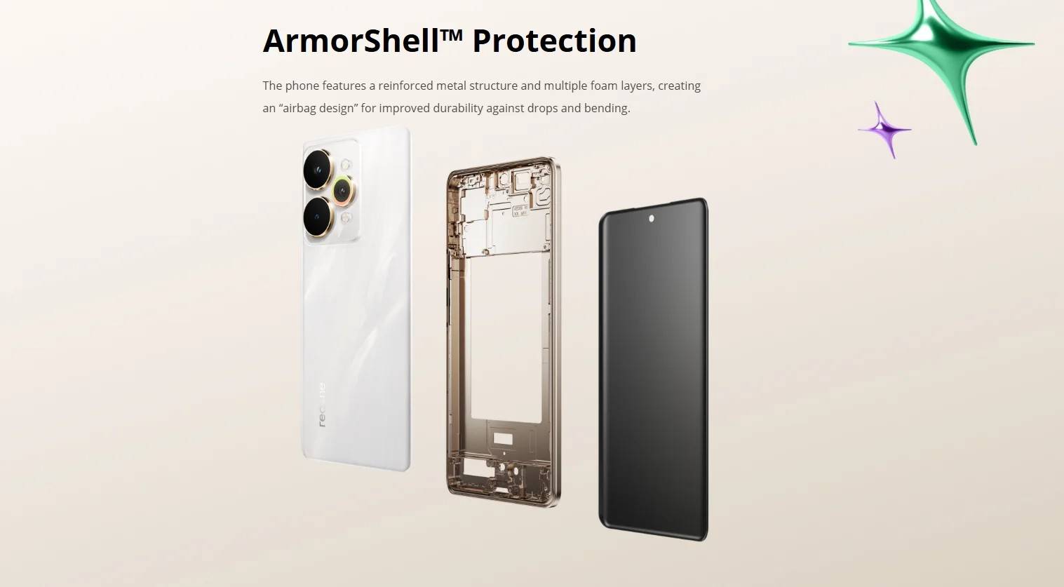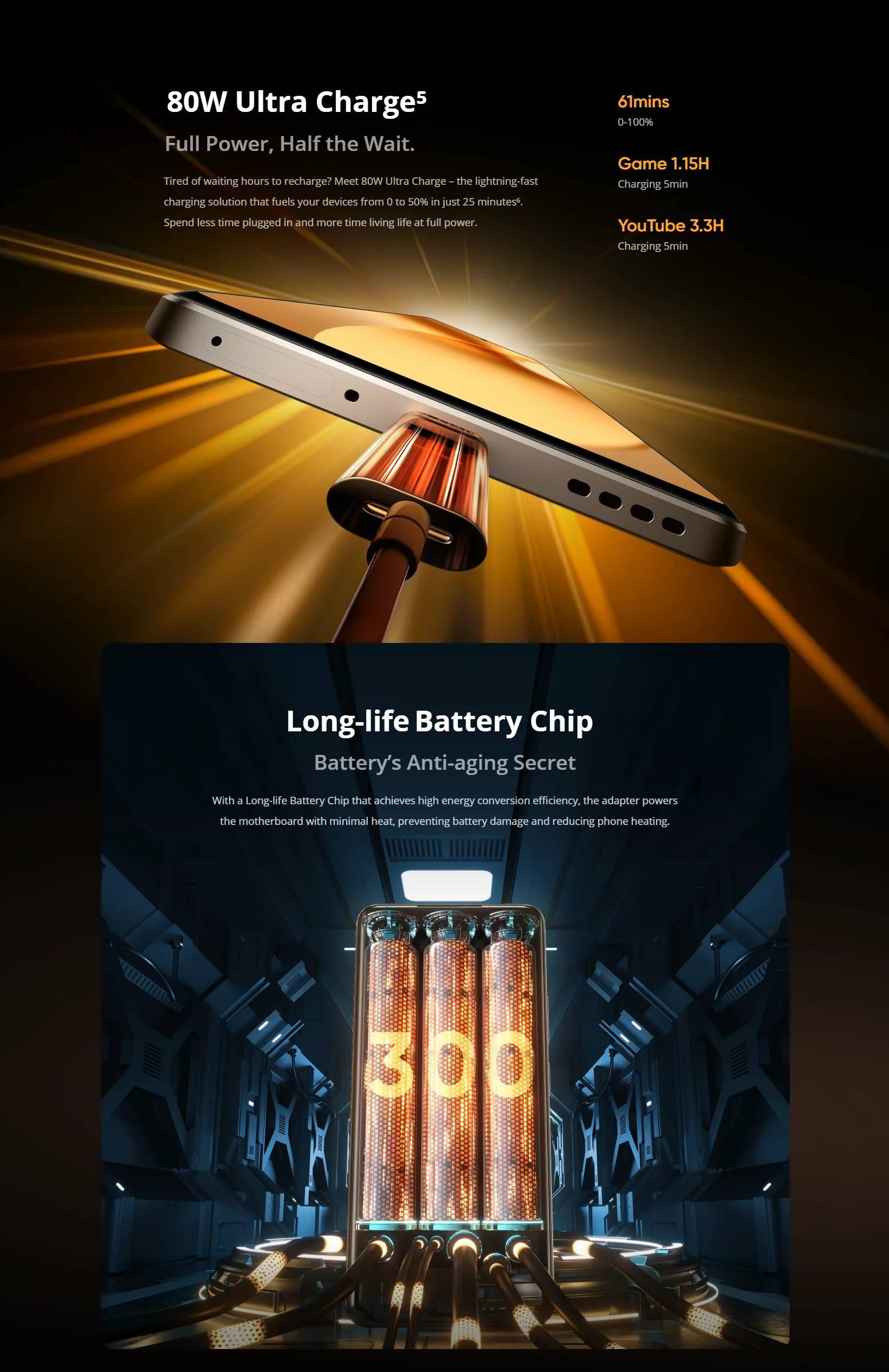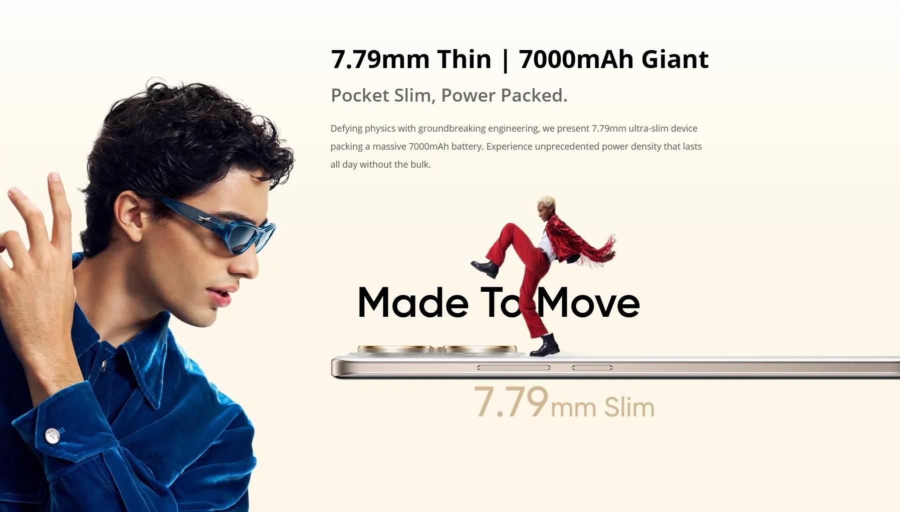 Processor ------- Qualcomm Snapdragon®7 Gen 4 Mobile Platform, 4nm Process, Octa-core Screen------------ 6.8 inches 144Hz HyperGlow 4D Curve+ Display, 1280*2800 Resolution, 1800nit(HBM)/ 6500nit Peak Brightness OS----------------- realme UI 6.0 Based on Android 15 Rear Camera --- 50MP Sony IMX896 OIS Camera + 50M Ultra Wide Angle Camera Front Camera -- 50M Front Camera Battery----------- 7000mAh (typ) Massive Battery, 6830mAh(min) Battery Capacity, 80W Ultra Charge Features--------- Support Wi-Fi 5 / Wi-Fi 6, Bluetooth 5.4, AI Party Mode, AI Edit Genie