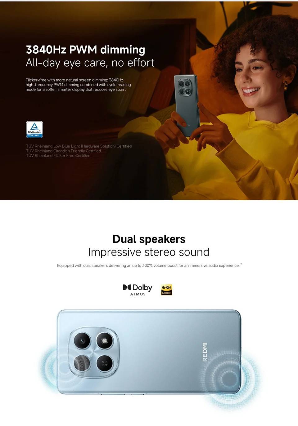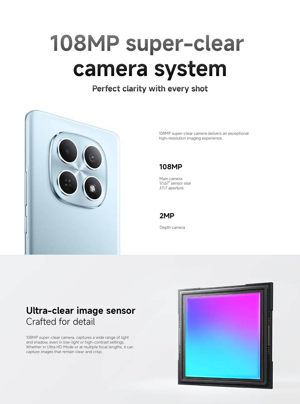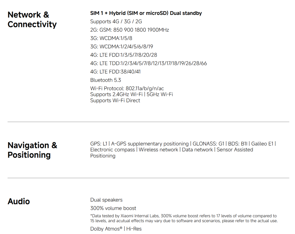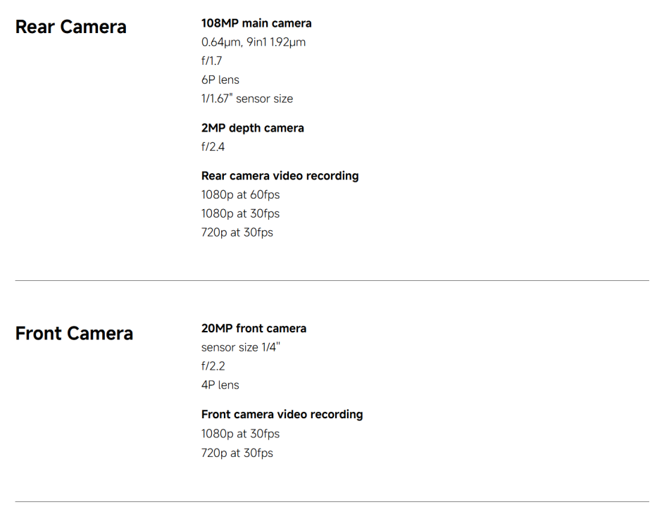 CPU ------------- MediaTek Helio G100-Ultra RAM+ROM ---- 6GB + 128GB | 8GB + 256GB Color ----------- Black| Blue| Green| Purple Screen ---------- 6.77" AMOLED display, 120Hz refresh rate Battery --------- 6000mAh (typ) battery, 33W turbo charging Camera -------- 108MP main camera + 2MP depth camera, 20MP front camera OS -------------- Global Version, Powered by Xiaomi HyperOS 2 Support Multi-Language and Google Play, In-screen fingerprint sensor、AI Face Unlock, Other ----------- Bluetooth 5.3, IP64 dust and water-resistant Network and Connectivity (SIM 1 + Hybrid (SIM or microSD) Dual standby) • 4G: LTE FDD:38/40/41 • 4G: LTE TDD:1/2/3/4/5/7/8/12/13/17/18/19/26/28/66 • 4G: LTE FDD:1/3/5/7/8/20/28 • 3G: WCDMA:1/2/4/5/6/8/19 • 3G: WCDMA:1/5/8 • 2G: GSM: 850 900 1800 1900MHz *Note: Please confirm the network frequency with local operator for ensure the network compatible before order!