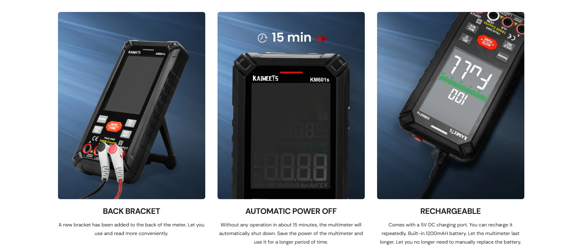 This multimeter tester has a rechargeable function and a built-in 1200mAh battery.