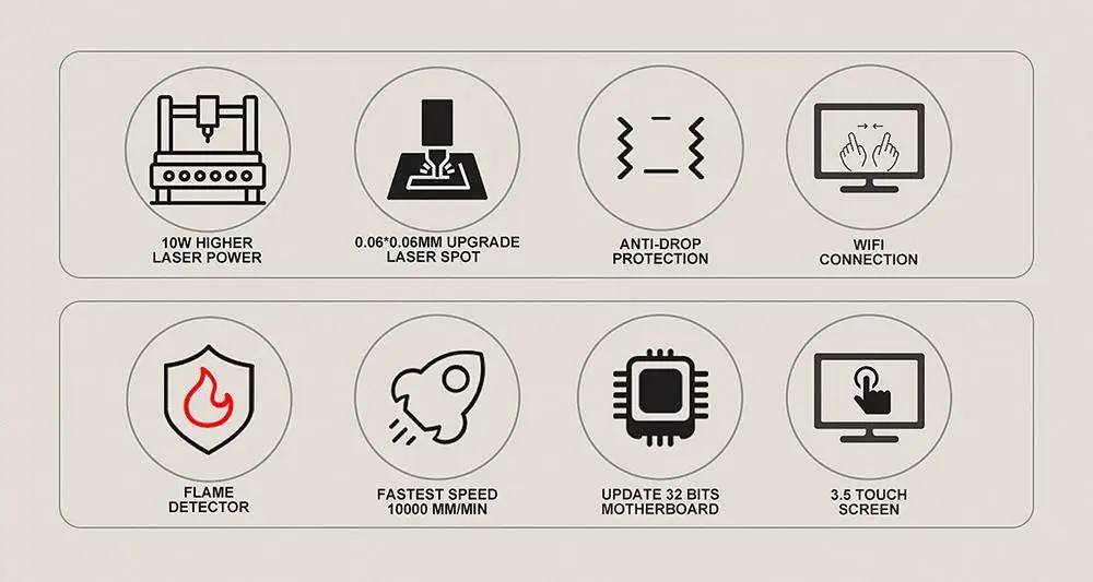 - 10W Laser Module - Remarkable improvements realized by the poly-lens spot com pression laser technology, 10000mm/min Max.engraving speed.