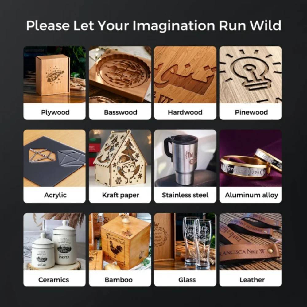 Cardboard, non-woven fabric, light wood, Acrylic material, thin plastic board. (Unable to engrave: blue/purple/white/transparent material, aluminum without oxide layer.)