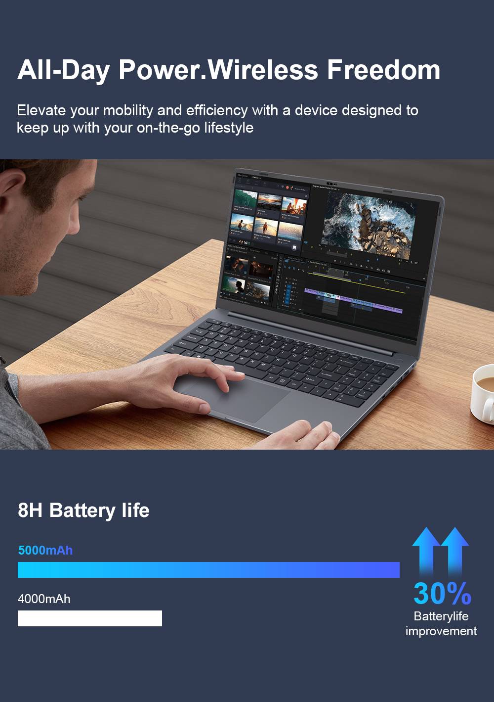 Battery Capacity: 7.6V 6000mAh, 45.6 Wh Removable: No (built-in) Adapter Input: 100–240V AC, 50–60 Hz Adapter Output: Up to 20V/3.25A, 65W (Smart Adapt) Adapter Weight: 157 g Plug Standard: Customized PD Charging: Not Supported