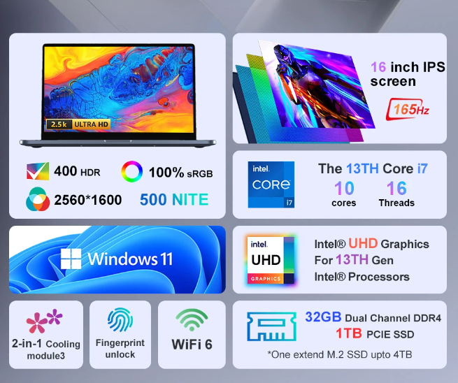 Ninkear N16 Pro Laptop, 16'' 2560*1600 IPS Screen, 165Hz Refresh Rate, Intel Core i7-13620H 10 Cores Up to 4.9GHz, 32GB RAM 1TB SSD, WiFi6, Bluetooth5.0, 1*USB2.0 2*USB3.0 1*Type-C 1*HDMI 1*RJ45, 5500mAh Battery, Fingerprint Unlock, Backlit Keyboard