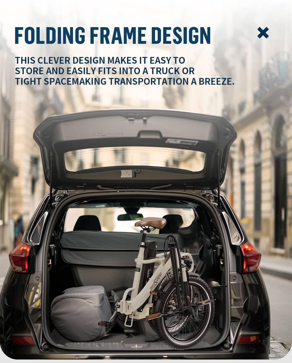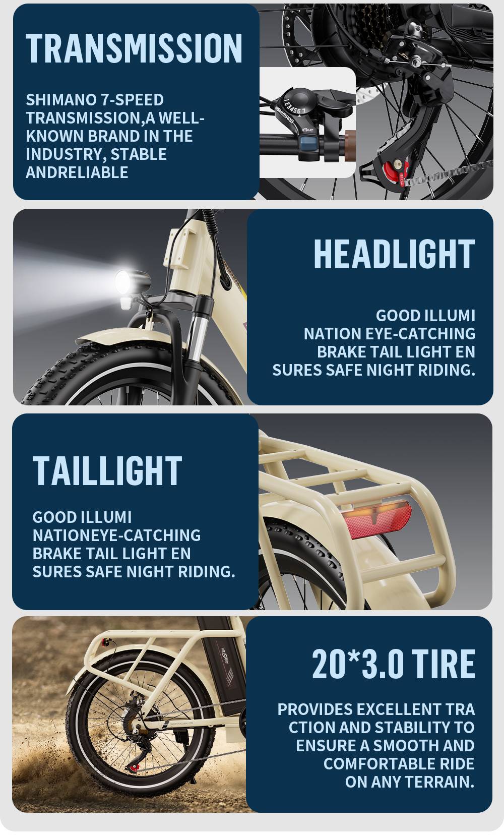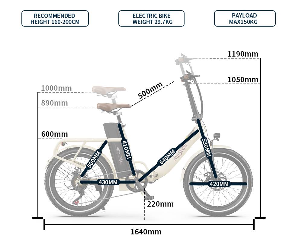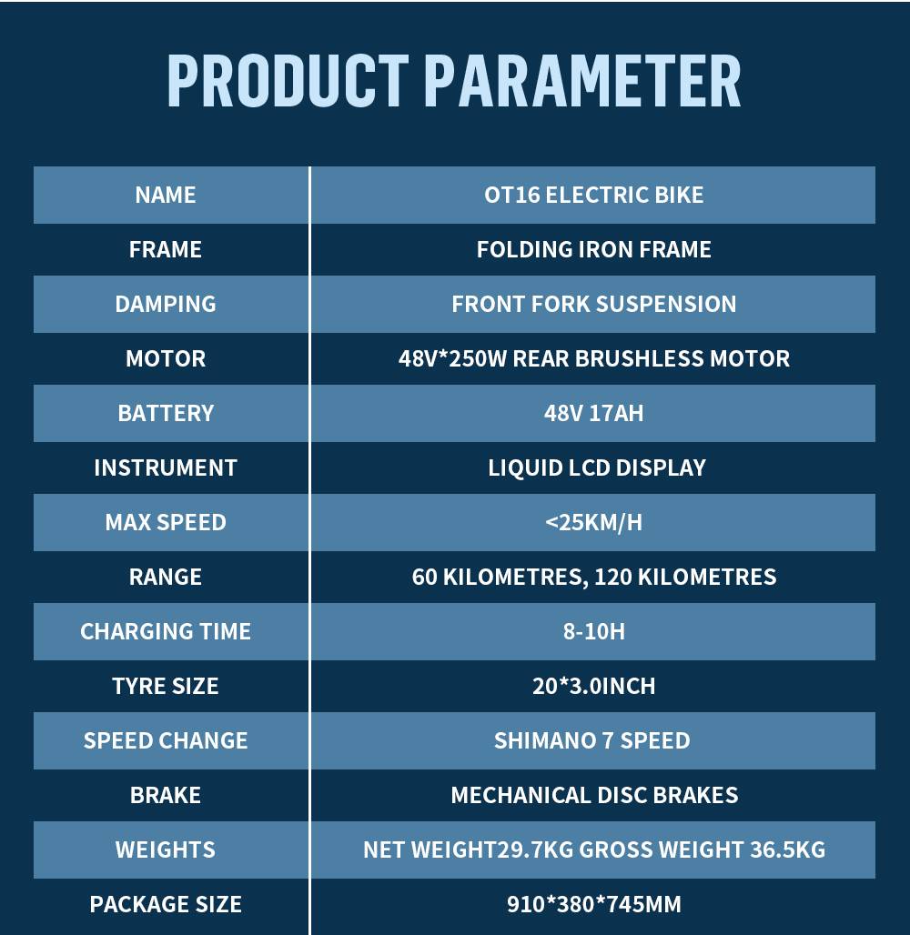 OT16-2 Specifications Frame:20-inch folding steel frame Colors:Black ,White Waterproof Rating:IPX5 Battery:48V 17AH Motor:48V 250W Gears:Shimano 1*7 speed Display:LCD screen,2.4-inch Bluetooth:Supported Riding Modes:Pedal Assist Mode (speed sensor), Riding Mode, Pure Electric Mode Brakes: Cable Brakes Seat Post:Aluminum alloy Tires:20 x 3.0 in. Pneumatic Off-road Tires Fenders:Front and rear fenders Max Climbing Angle:30° Charging Time:8-10 hours Battery Dimensions:380*110*78mm, Net Weight: Approx. 4 kgOther Specifications Product Dimensions:1640*560*1050~1190mm (handlebar length:57cm) Package Dimensions:910*380*745mm Foldable:Yes Net Weight:29.7Kg Gross Weight:36.5Kg Max Load:150kg Suitable Height:160-200cm Max Speed:25km/h Speed Limitation:Cannot be unlocked Saddle Height:770-900mm from the ground Charger:54.6V 2A (Input:110V-240V) Controller:Sine wave controller (48V 15A, Jinghui) Range:60km pure electric mode, 120km pedal assist mode (depending on road conditions, speed, and driver weight). Front Fork Travel:40mm Motor Torque:40Nm Bluetooth:Supports connection to ONESPORT EBIKE APPPackage Includes Charger, user manual, tool kit, throttle grip, pedals, quick-release axle, air pump, phone bag, bell, cable ties