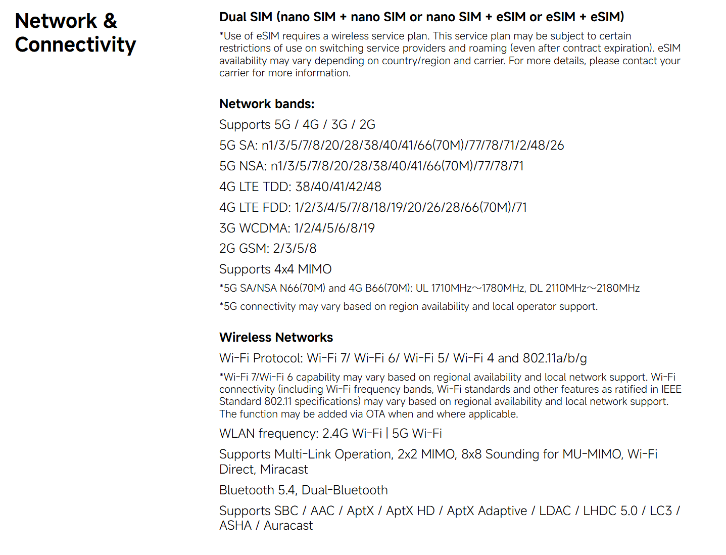 Other--------NFC,Wi-Fi 7, Bluetooth 5.4, GPS Network:Dual SlM (nano SlM + nano SlM or nano SIM+eSIM or eSIM+eSIM) Network band: Supports 5G/4G/3G/2G -5G SA:n1/3/5/7/8/20/28/38/40/41/66(70M)/77/78/71/2/48/26 5G NSA: n1/3/5/7/8/20/28/38/40/41/66(70M)/77/78/71 4G LTE TDD: 38/40/41/42/48 4G LTE FDD: 1/2/3/4/5/7/8/18/19/20/26/28/66(70M)/71 3G WCDMA: 1/2/4/5/6/8/19 -2G GSM: 2/3/5/8 Supports 4x4 MIMO *5G SA/NSA N66(70M) and 4G B66(70M): UL 1710MHz~1780MHz, DL 2110MHz~2180MHz *5G connectivity may vary based on region availability and local operator support. Wireless connectivity: Bluetooth 5.4 -Wi-Fi Protocol: Wi-Fi 7/ Wi-Fi 6/ Wi-Fi 5/ Wi-Fi 4 and 802.11a/b/g