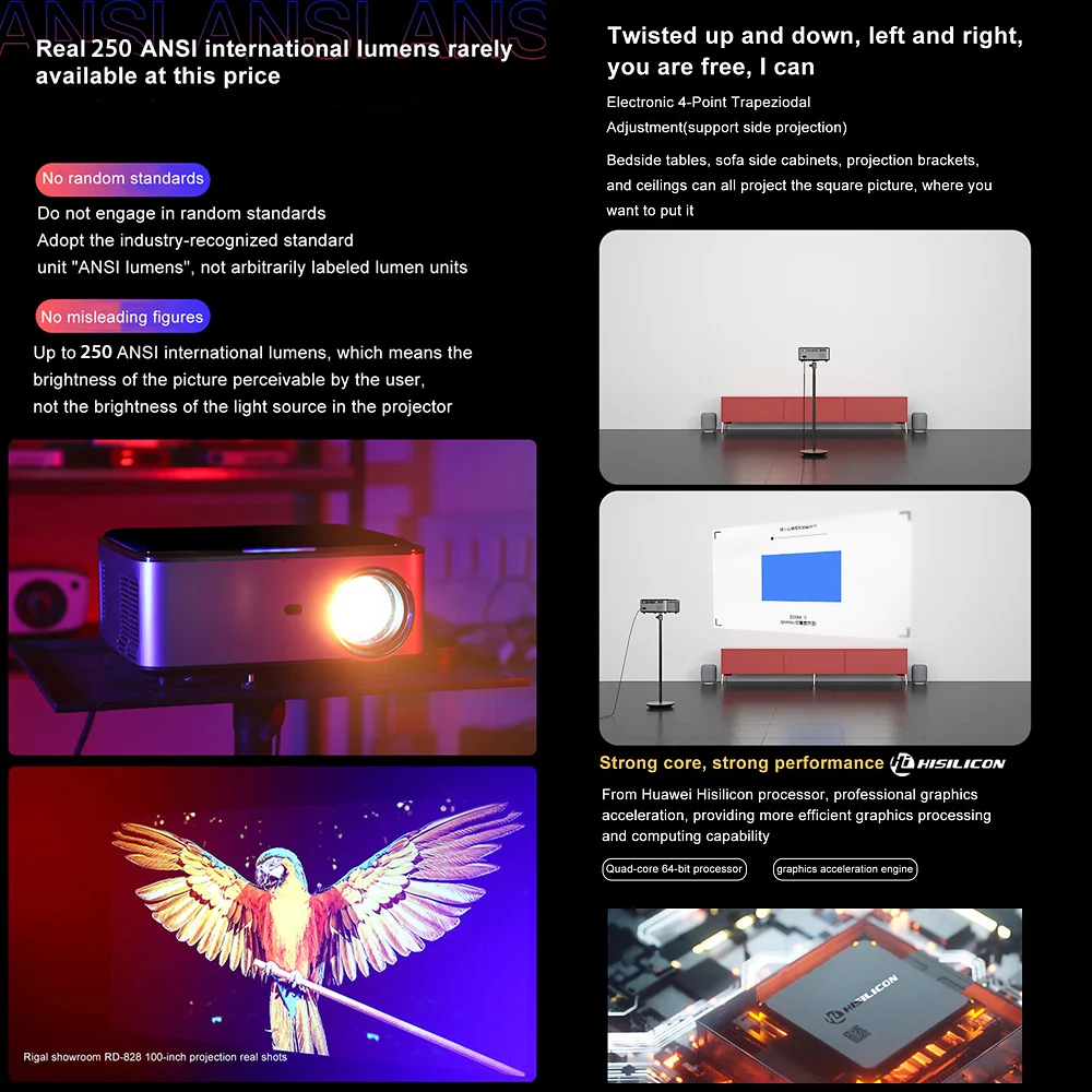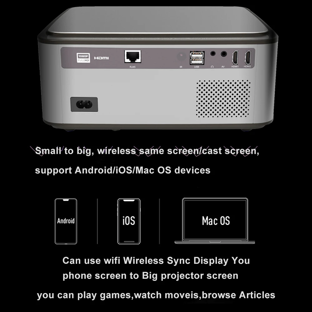 Connecting Multiple Devices - This portable movie projector can be easily connected to laptops, smart phones, USB sticks, etc., which supports HDM interface, network interface, AV/audio port.