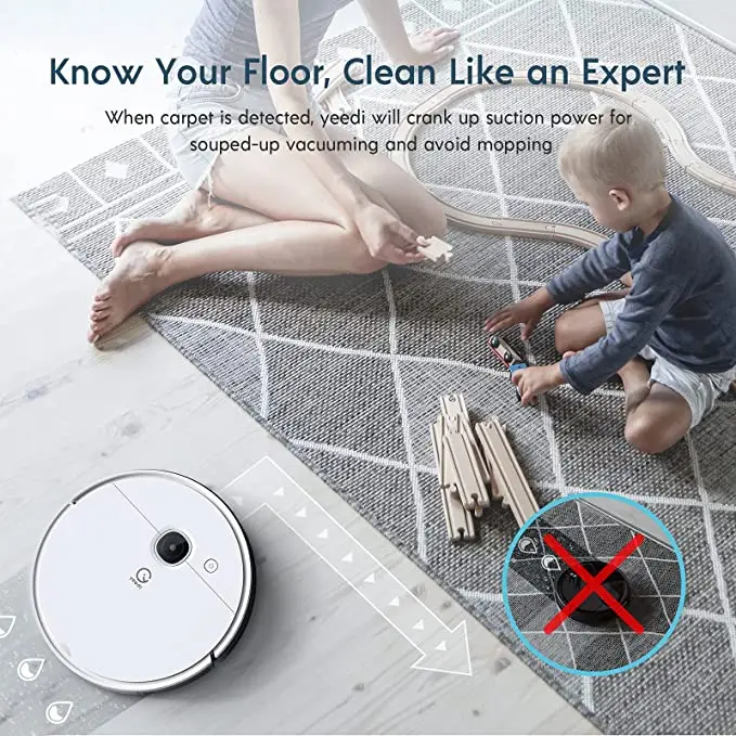 [Power suction 3000Pa ] yeedi robot vacuum cleaner scrubber connected with a vacuum system is classic that flap the dust to the center, it's hot lift pet hair, crumbs, dirt and debris as a hurricane. Then dirts and dust are oriented to the tank dedicated, equipped with a check valve and filter system. It works perfectly on carpet and hard soil like tiles, flooring, etc.