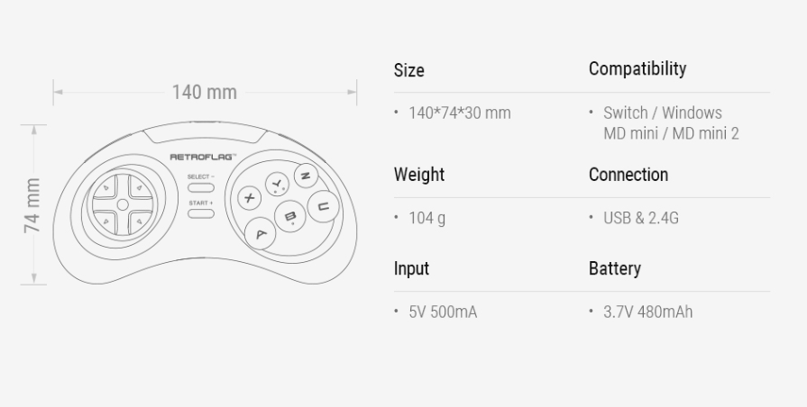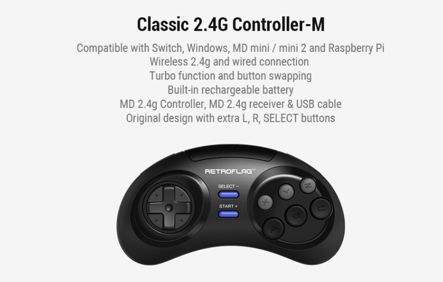 Retroflag Wireless Gamepad Classic 2.4G Controller-M Turbo Function Button Swapping Battery Rechargeable for NS Windows MD mini/mini 2 Raspberry Pi - Black
