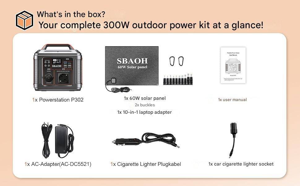 Manufacturer :SBAOH Part Number :P302+60W Item model number :P302+60W Size :300W+60W Solarpanel Power Source :Battery Powered Wattage :296 Watt Hours Included Components :Portable power station, USB-C to USB-C charging cable, safety instructions.