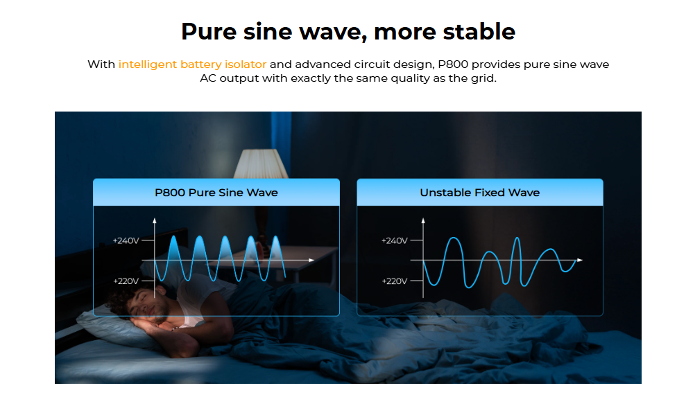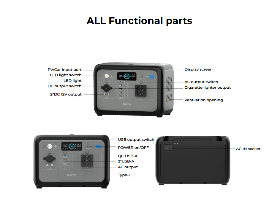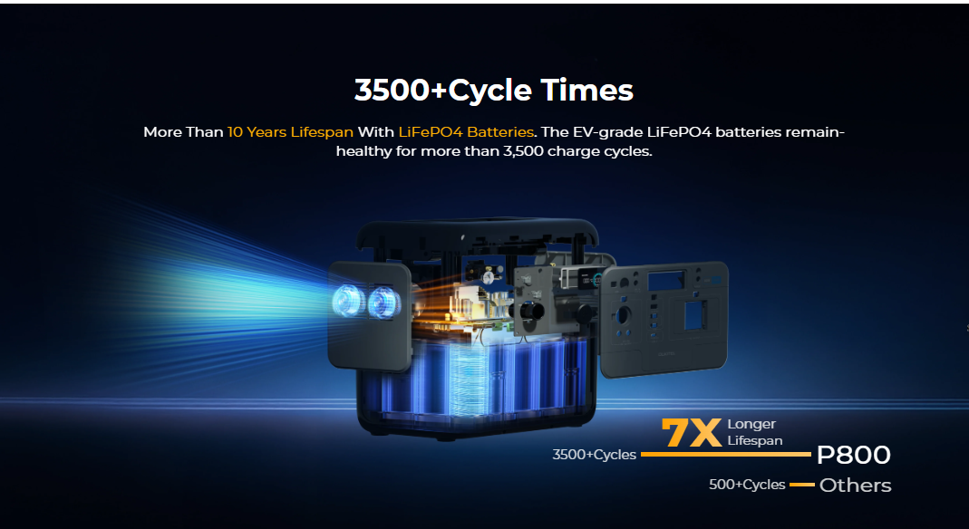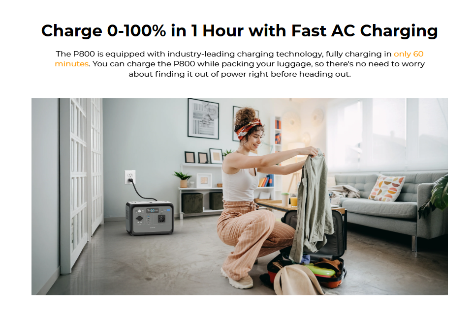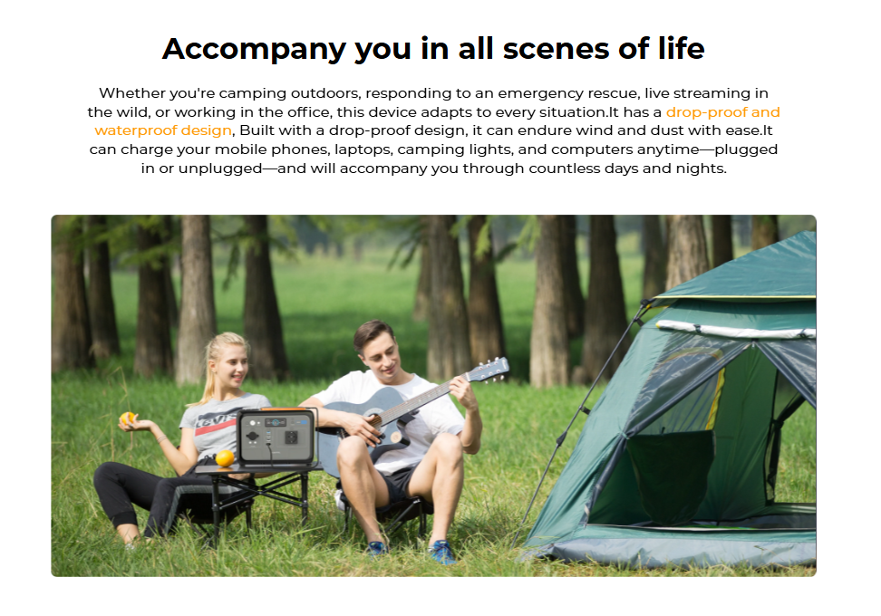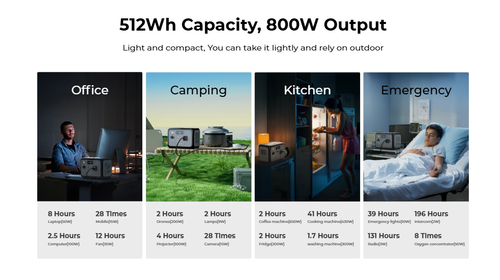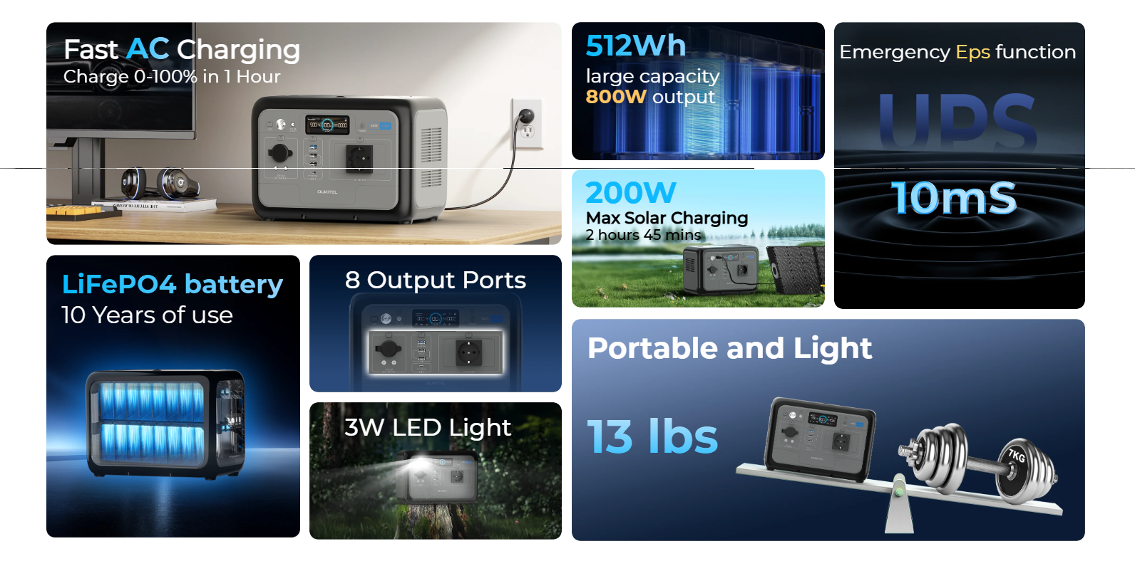2. Powerful Multi-Port Output:Delivers 800W of AC power with a 512Wh capacity. Equipped with 9 output ports to charge multiple devices simultaneously.
