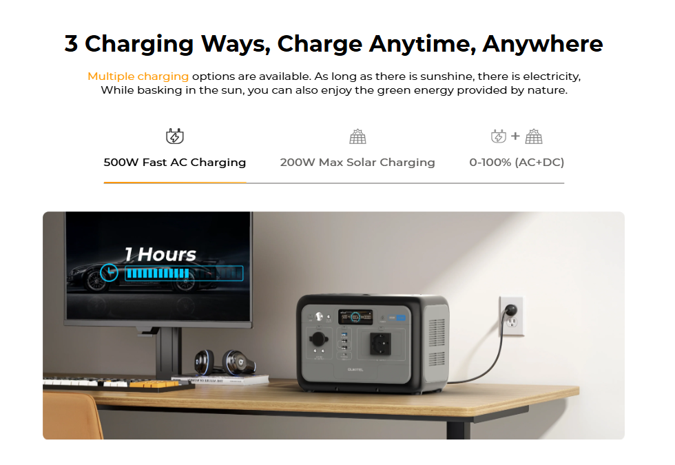 3. Ultra-Fast Dual Charging:Supports 500W AC fast charging for a full charge in 1 hour. Compatible with 200W solar input for a full charge in 2 hours 45 minutes.