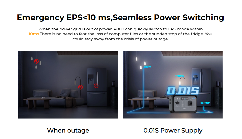 4. Seamless Emergency Power:EPS mode activates in <10ms, providing instant backup during power outages to prevent data loss and equipment damage.