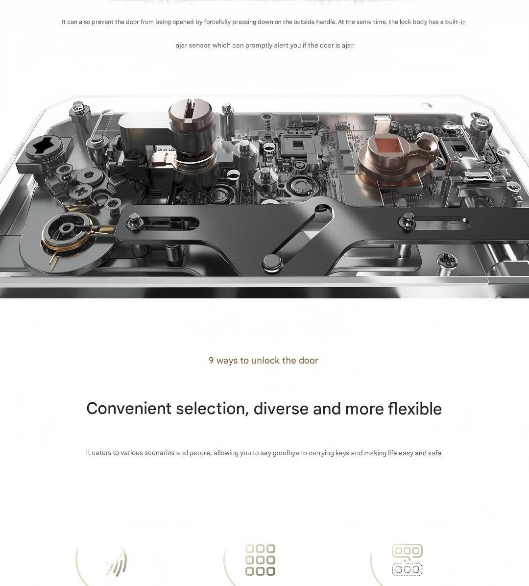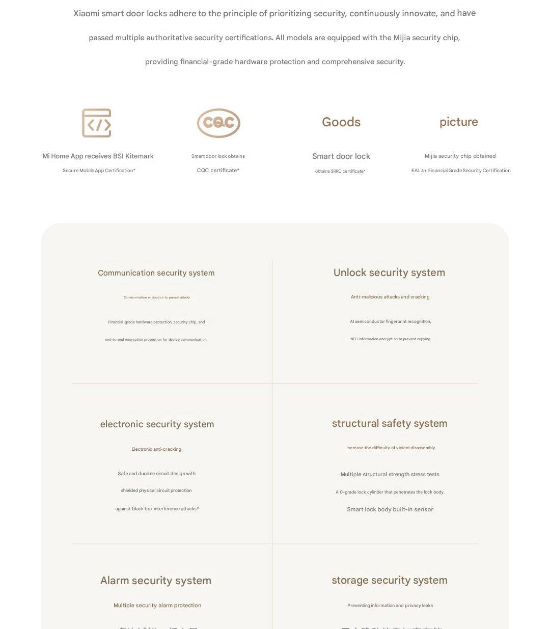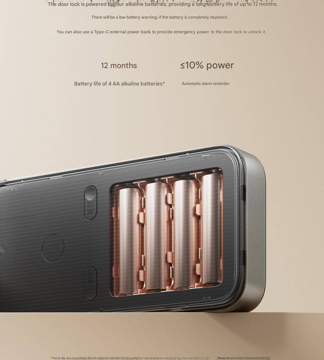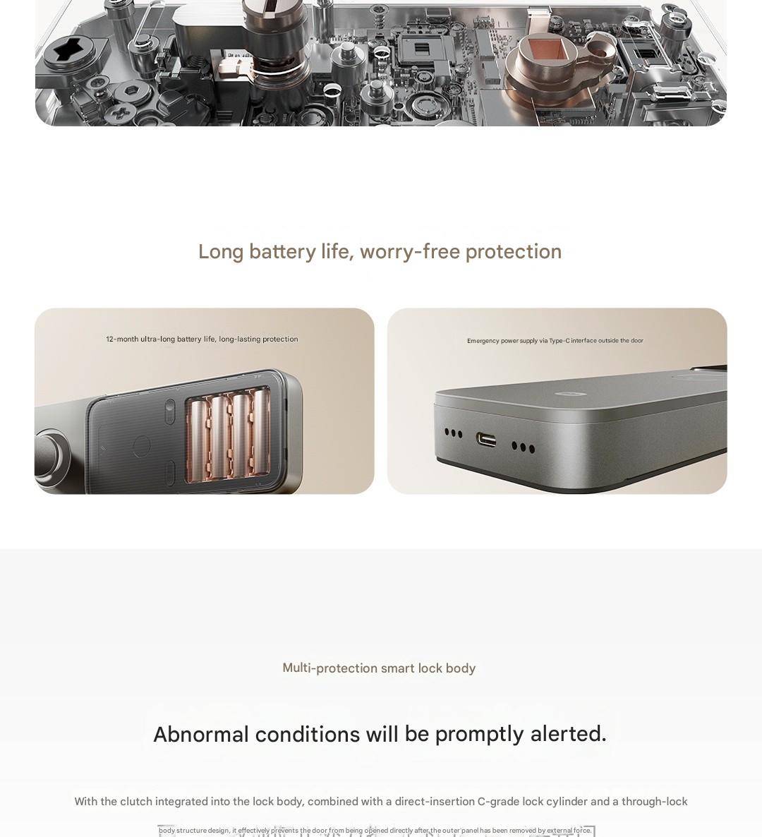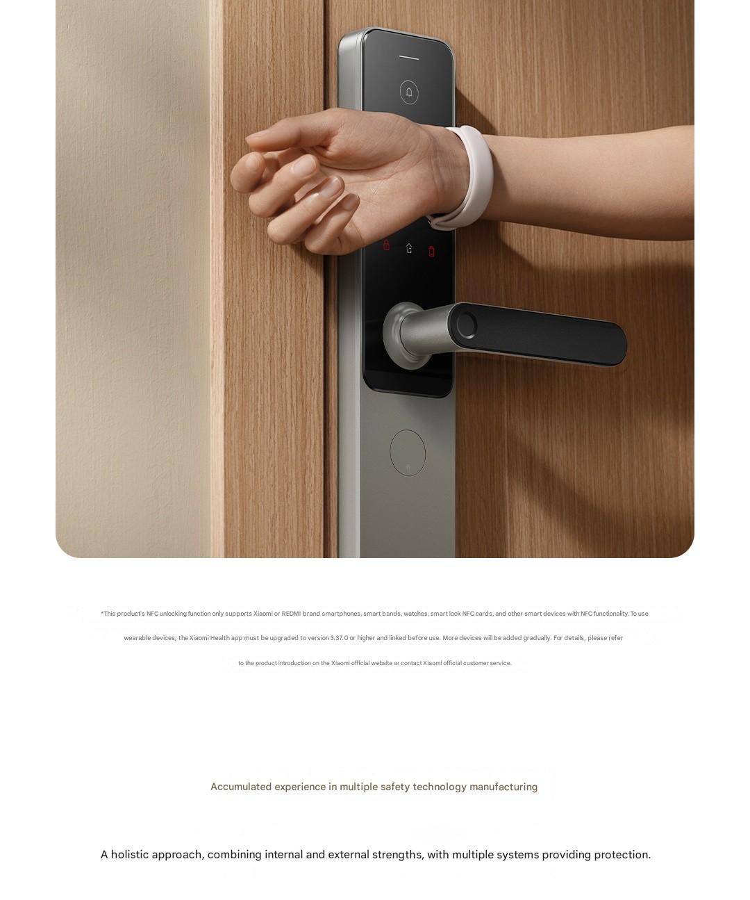 Product model:XMZNMST10LK Product size:367x76x23mm (front panel) 367x76x25mm (rear panel) Net weight of the product:approximately 3.3kg Power supply mode:4 sections of No. 5 alkaline dry batteries; Type-C emergency power supply (5V... 0.5A) Product safety level:B level (GA 374-2019) Lock cylinder security level:C level Wireless connection:Bluetooth 5.0 NFC Environmental adaptability level:I1 level (GA 374-2019) Working humidity:0-93% RH, no condensation Working temperature:- 25°C~55°C
